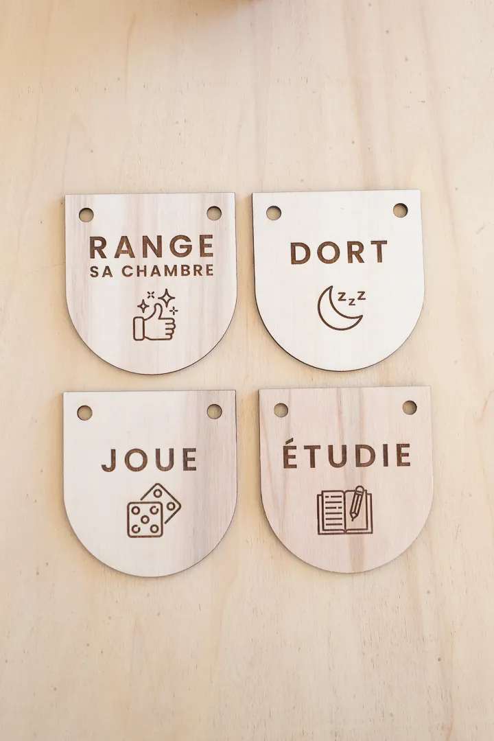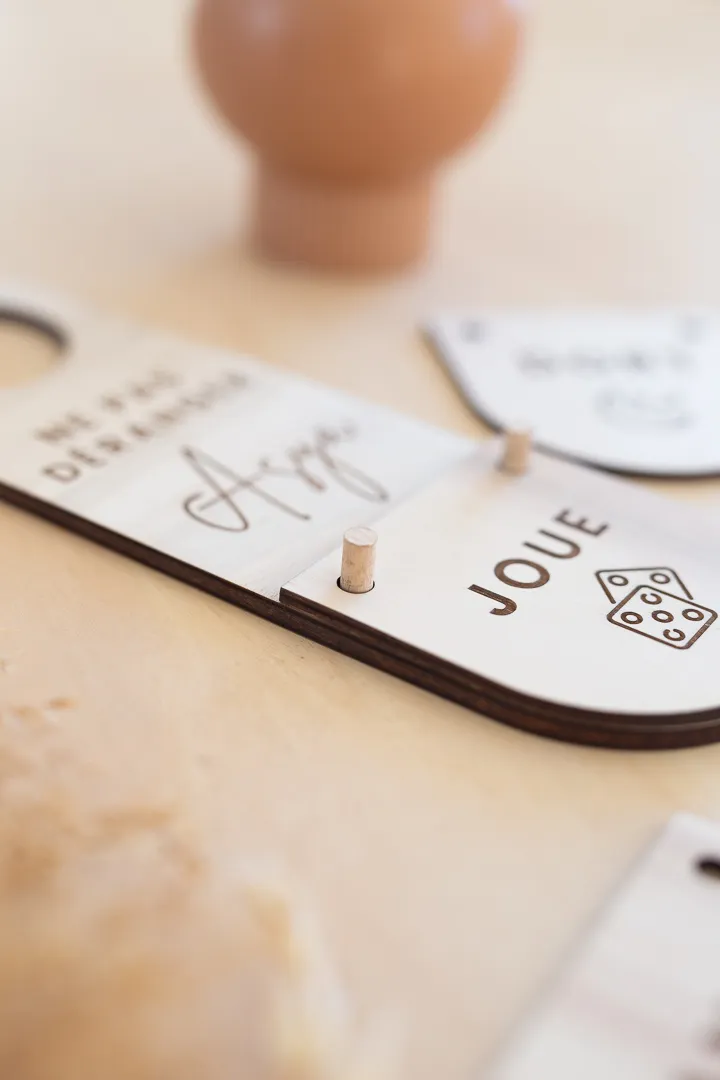 Dormir, Jouer, Étudier ou Ranger sa chambre sont les 4 possibilités écrites sur les petits écriteaux de bois, que l’enfant pourra changer facilement et à sa guise.