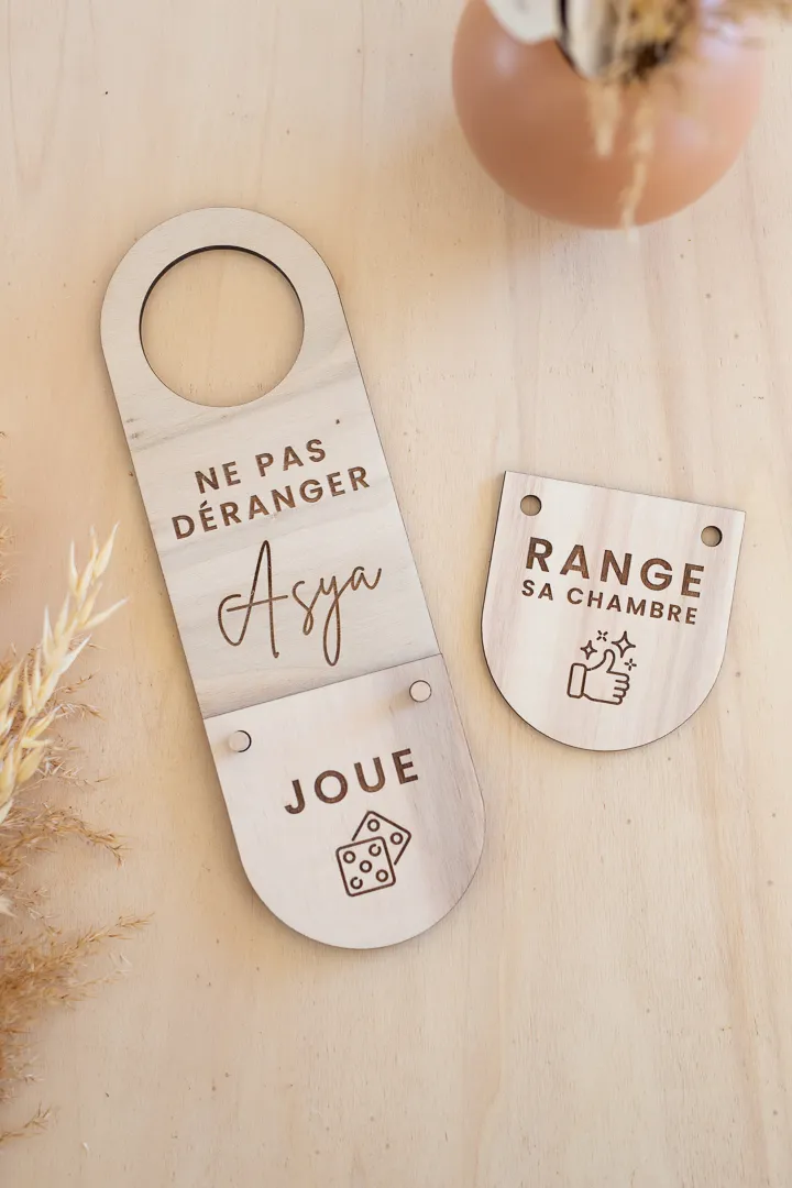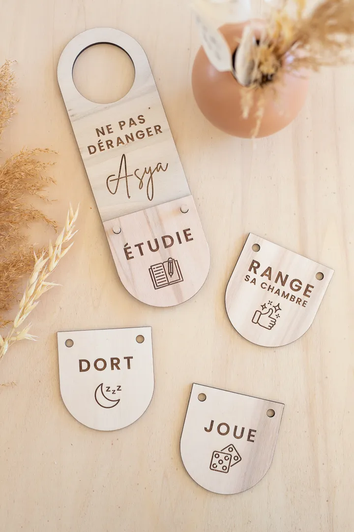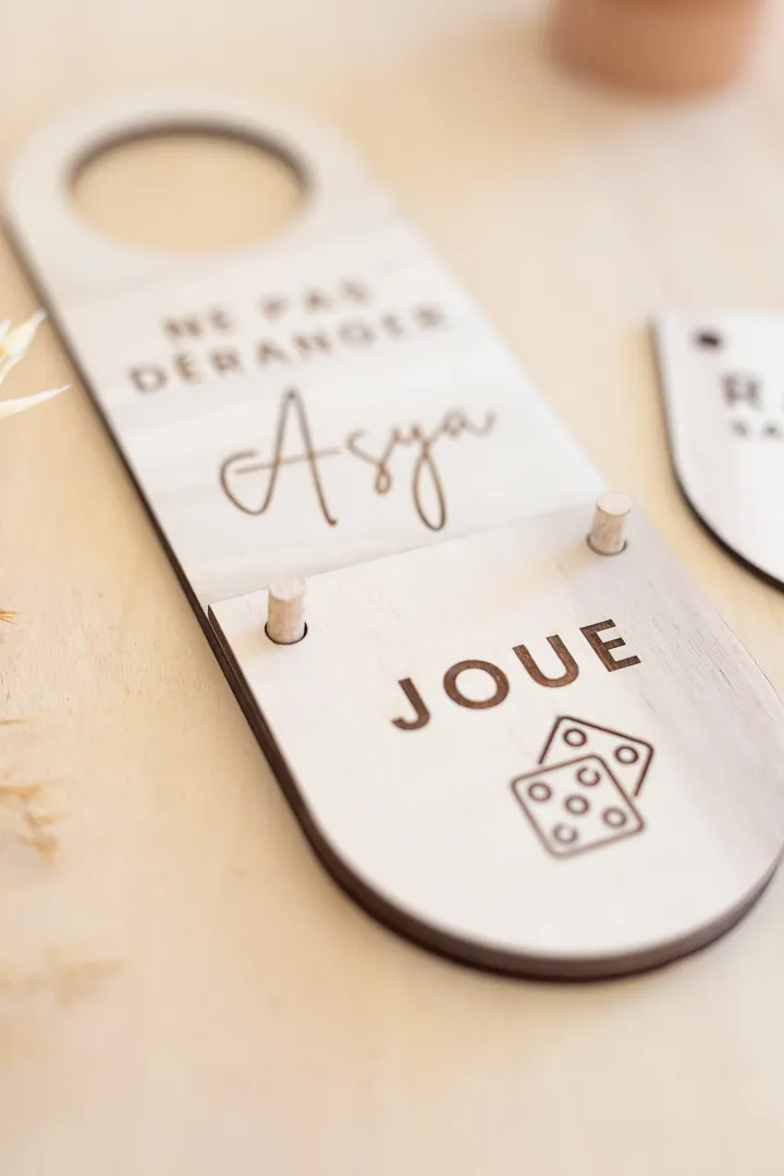 Pancarte accroche-porte en bois fournie avec 2 écriteaux en bois pour les 4 actions gravées recto/verso.