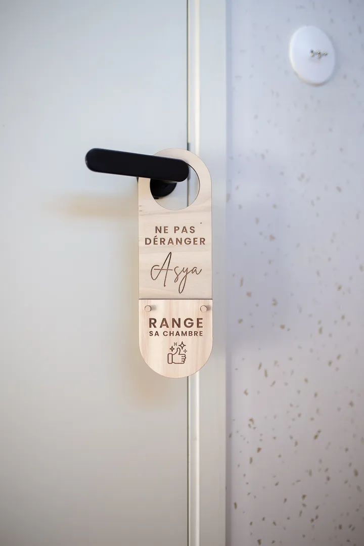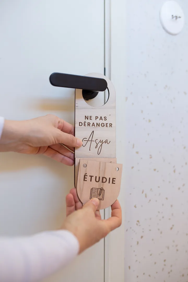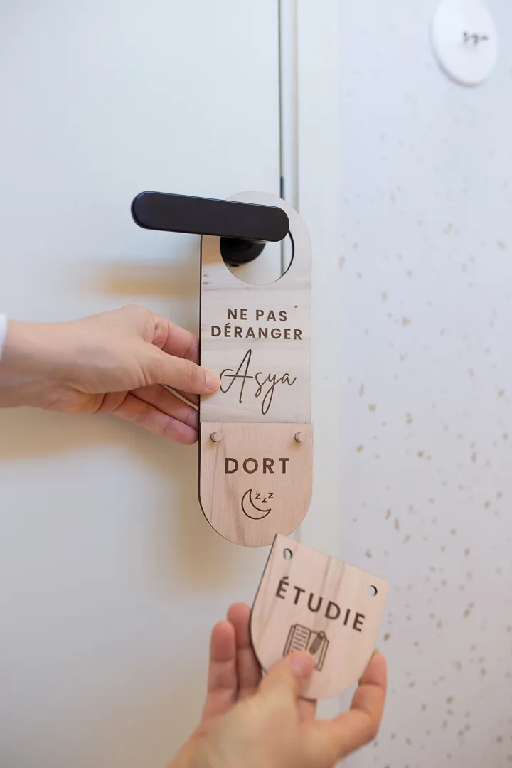 Cette pancarte accroche-porte « Ne Pas Déranger », suivie de 4 actions, est à personnaliser au prénom de l’enfant. Un jour, qui arrive toujours trop vite, votre enfant grandit, il passe de plus en plus de temps seul dans sa chambre à jouer, rêver ou étudier (parfois !), sa porte se ferme de plus en plus souvent et il se crée sa petite bulle d’intimité ! Cette pancarte lui permettra de vous faire savoir gentiment et joliment ce qu’il est en train de faire dans sa chambre. Dormir, Jouer, Étudier ou Ranger sa chambre sont les 4 possibilités écrites sur les petits…