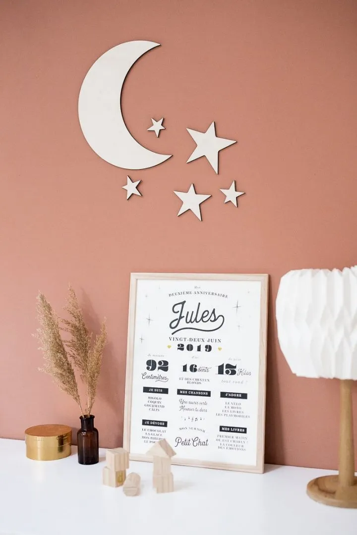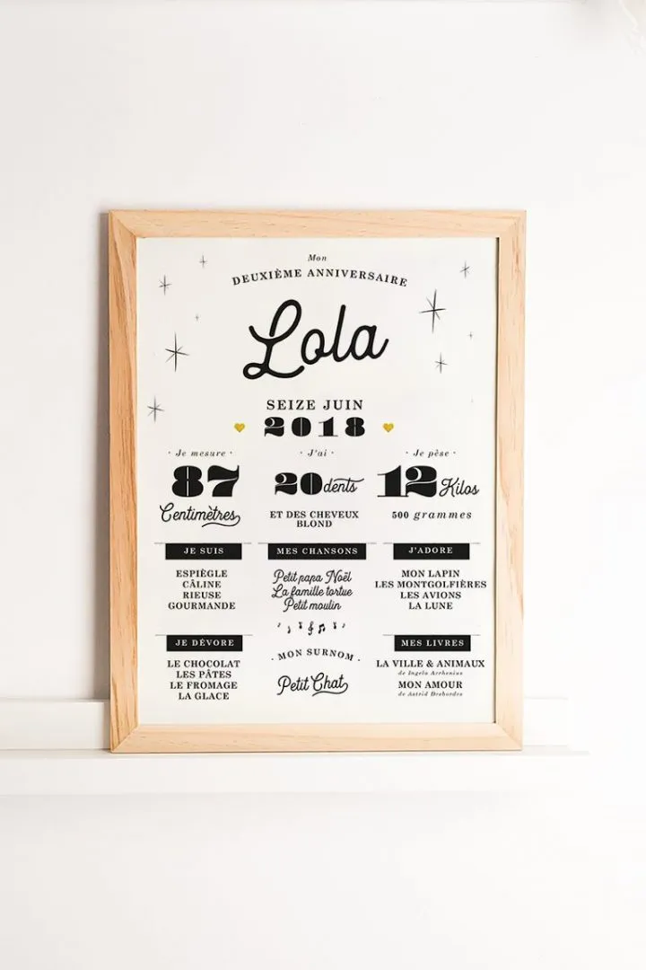 Affiche sur mesure pour fêter le deuxième anniversaire de votre enfant ! Un souvenir de tout ce qu’il sait faire, aime, mesure et pèse à l’aube de ses deux ans. Une version pour jumeaux est également disponible. Affiche 30x40cm, impression sur papier de qualité blanc avec un encadrement en bois naturel sans vitre. Délais de fabrication : 5 à 7 jours Livraison : 48h