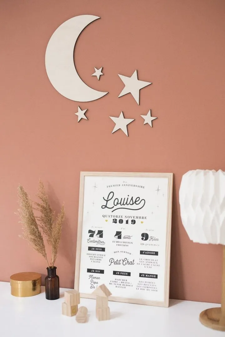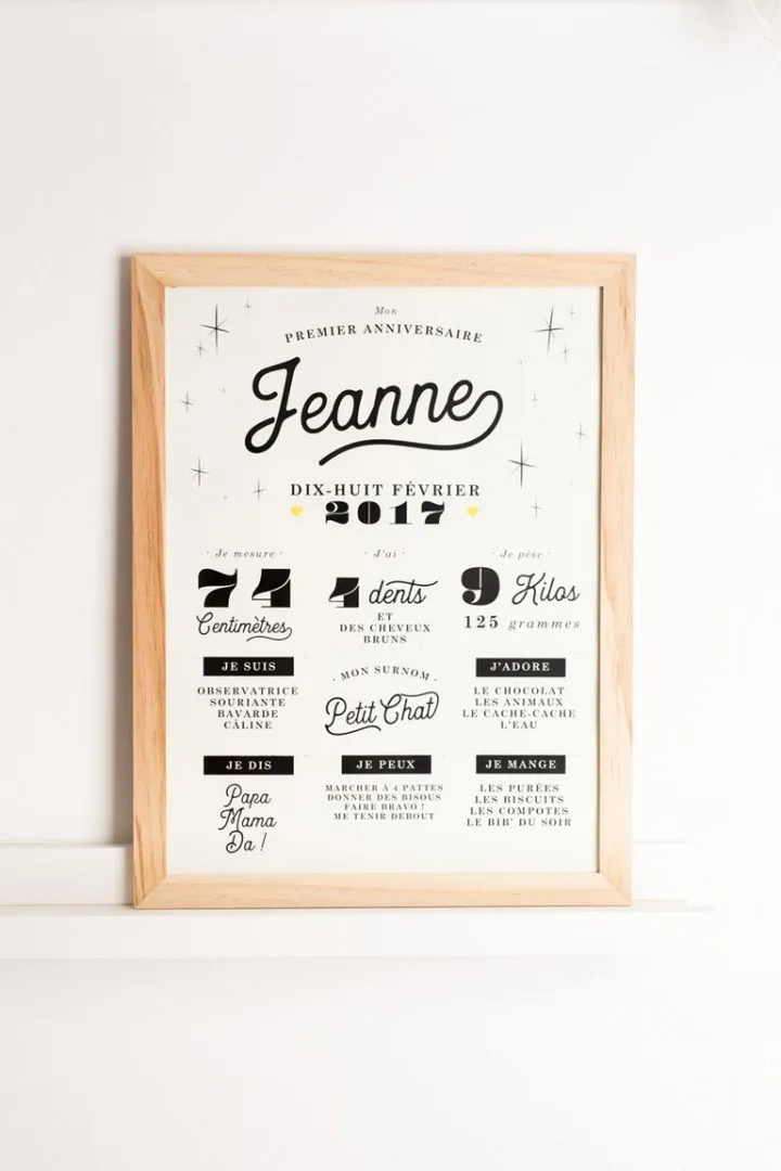 Affiche sur mesure pour fêter le premier anniversaire de votre enfant ! Un souvenir de tout ce qu’il sait faire, aime, mesure et pèse à l’aube de ses un an.