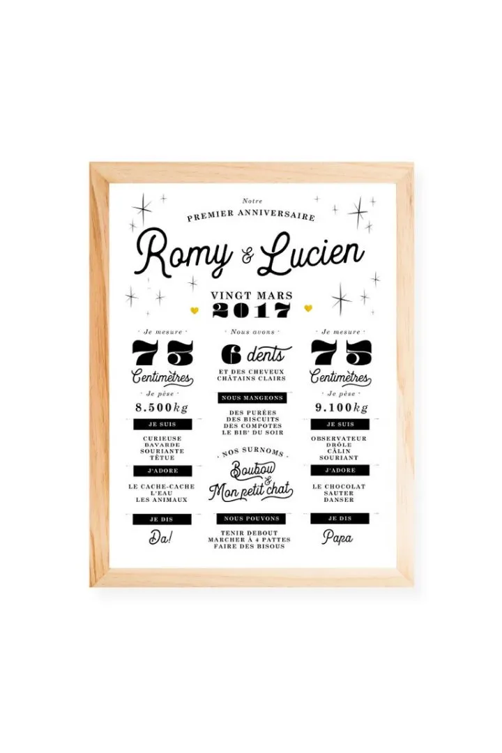 Affiche sur mesure pour fêter le premier anniversaire de votre enfant ! Un souvenir de tout ce qu’il sait faire, aime, mesure et pèse à l’aube de ses un an. Une version pour jumeaux est également disponible. Affiche 30x40cm, impression sur papier de qualité blanc avec un encadrement en bois naturel sans vitre. Délais de fabrication : 5 à 7 jours Livraison : 48h en colissimo