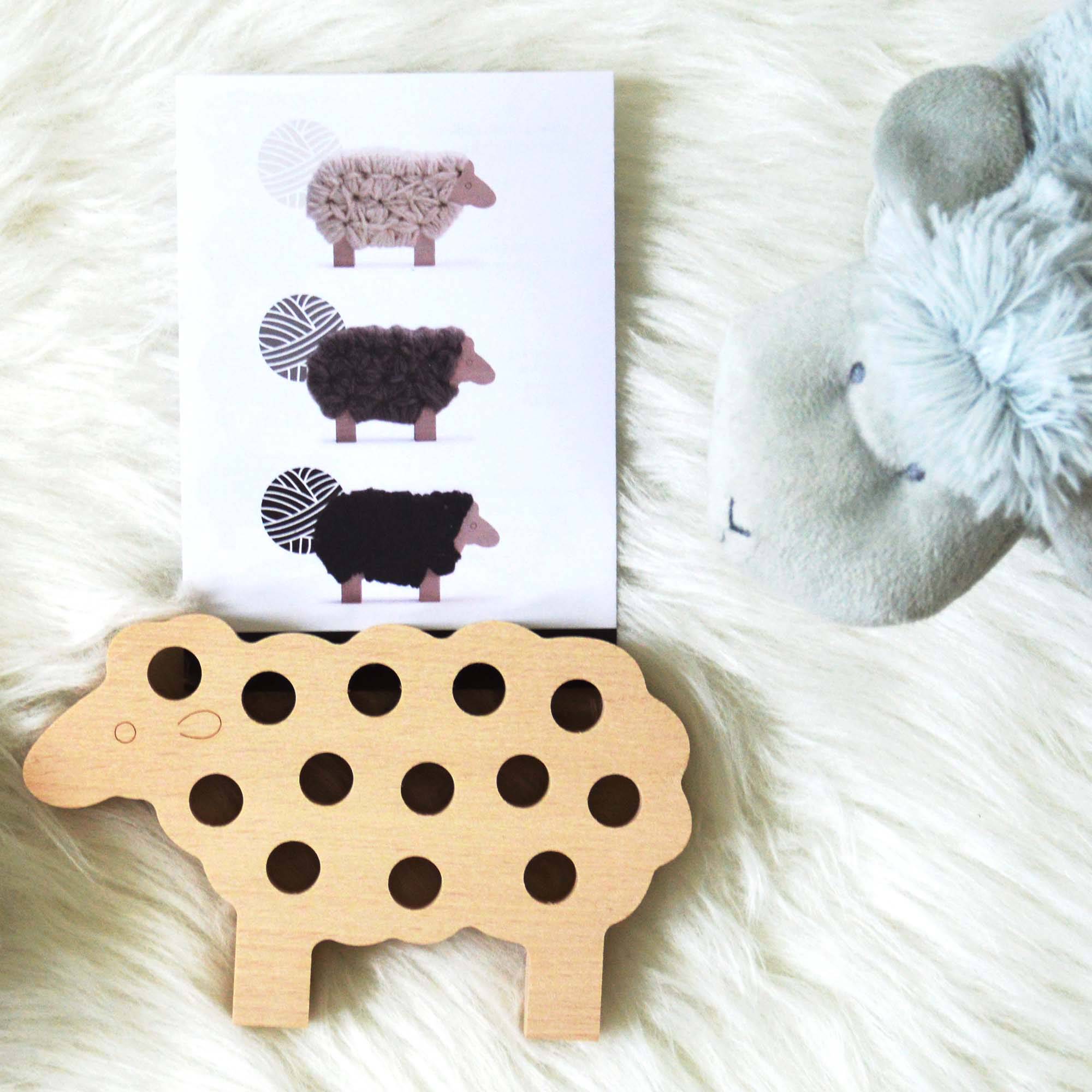 * mouton ludique au corps en bois à trous, pour passer la laine (beige) à l’intérieur