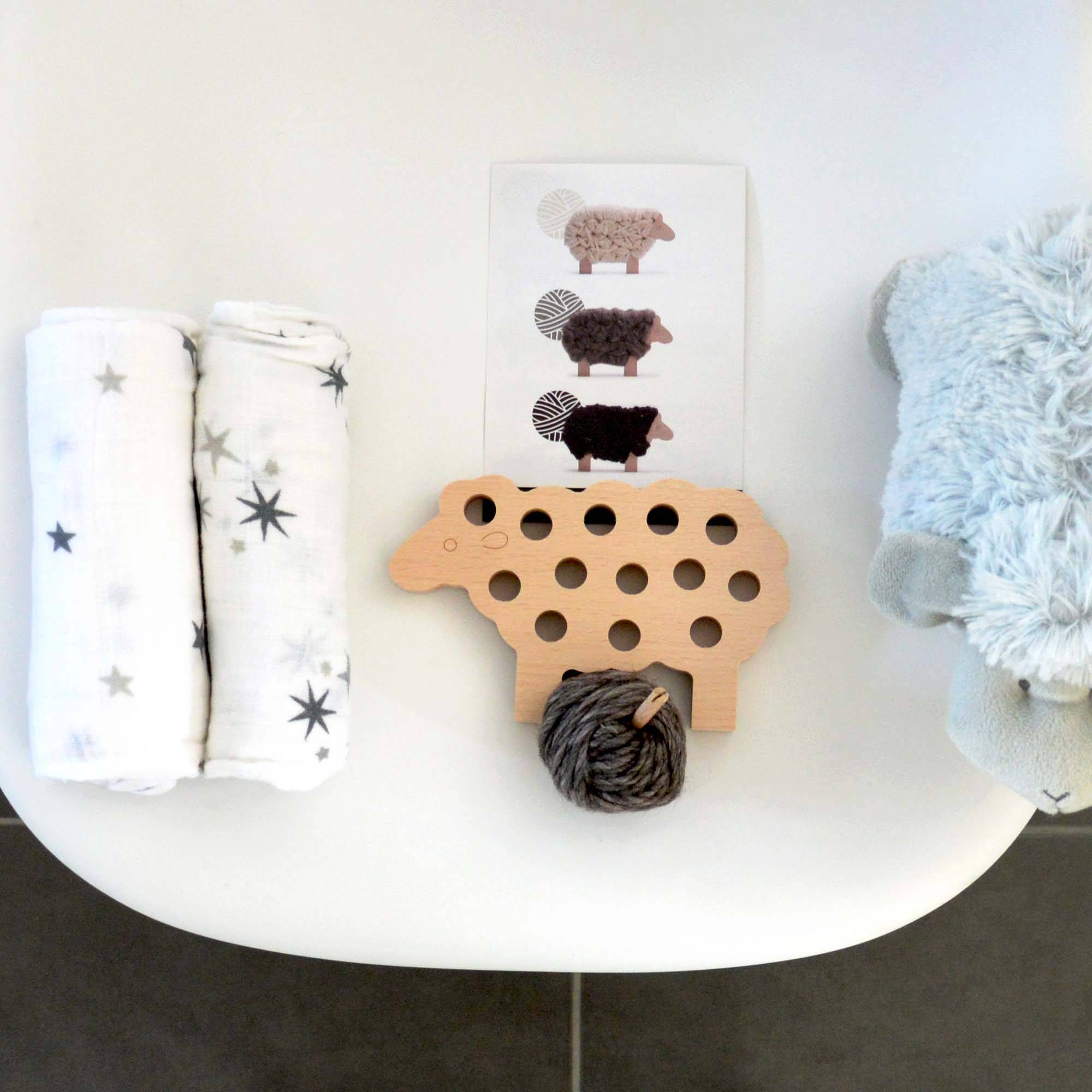 * mouton ludique au corps en bois à trous, pour passer la laine (gris) à l’intérieur