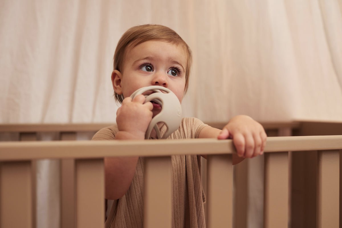 Cette balle amusante en silicone est disponible dans des couleurs neutres biscuit en nougat. Laquelle est votre préférée ?