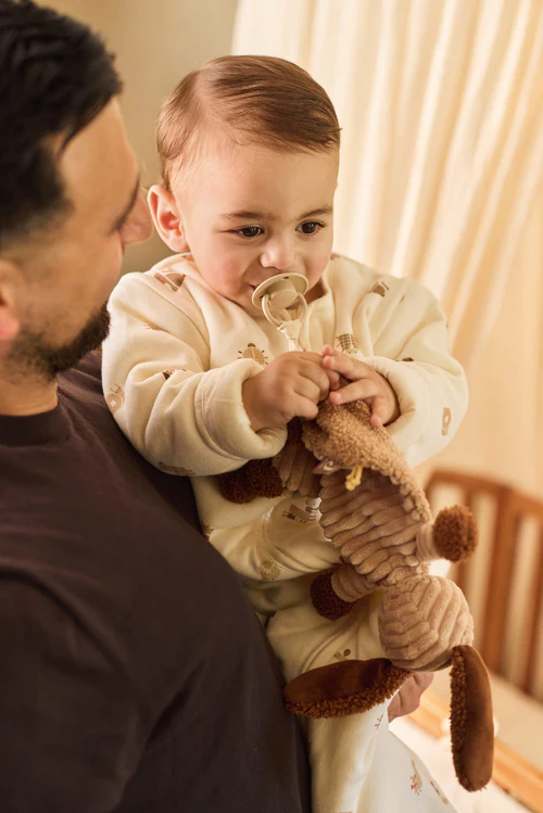 Ce attache-tétine Animal Friends a la forme d’un adorable petit chien nommé Diego. Fabriqué en tissu côtelé biscuit avec des oreilles, mains et pieds en bouclé marron cuir, il est aussi mignon que doux.