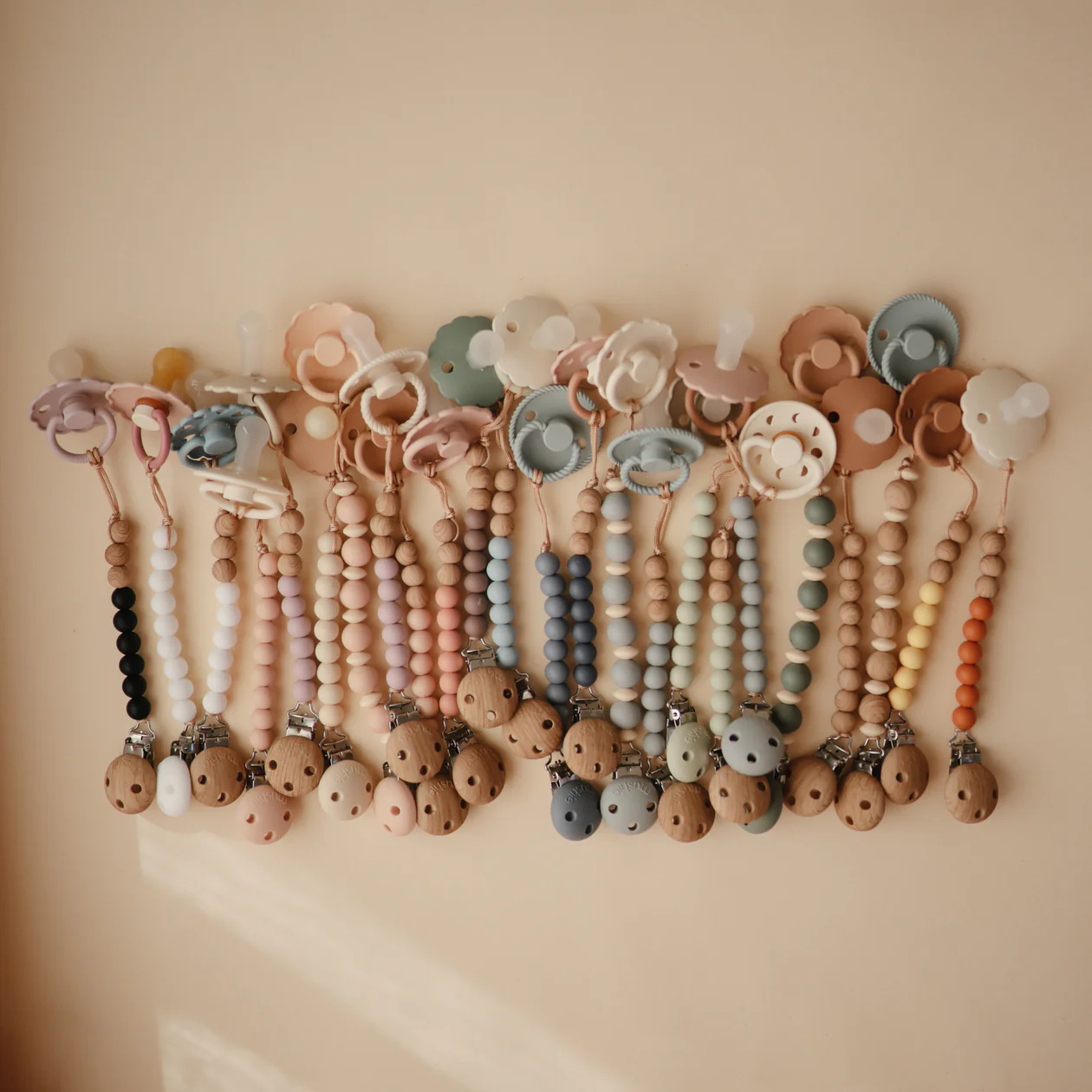 Une jolie attache tétine en silicone et bois.