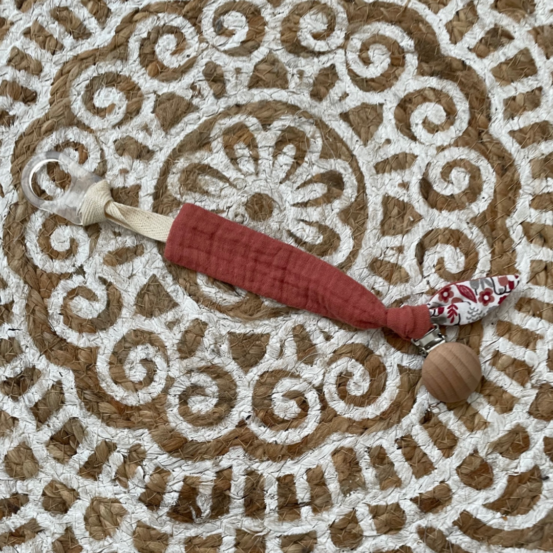 Fini de perdre la tétine … Personnalisez votre Attache Tétine en choisissant le thème et la couleur et ajoutez le prénom. Couleurs / motifs : vieux rose / liberty