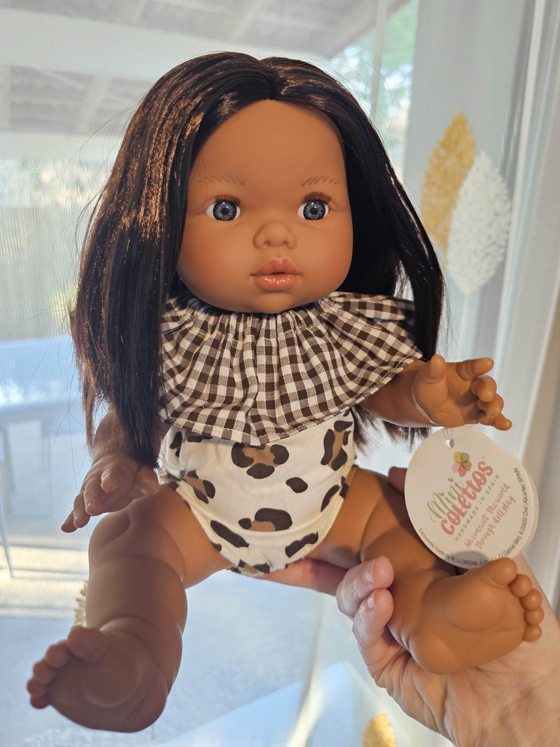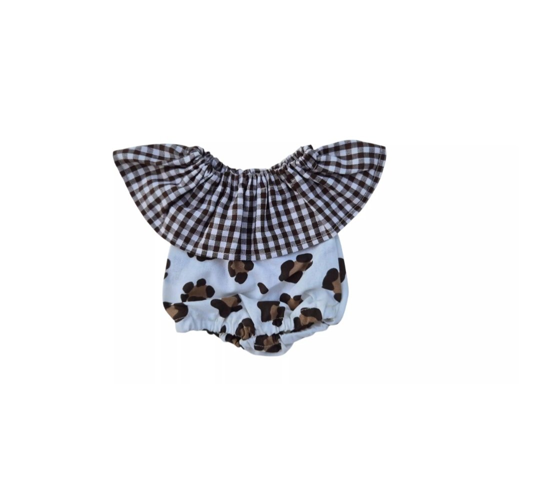 Jolie barboteuse avec imprimé léopard et col vichy (Sur la photo poupée Isabel vendue séparément) Convient aux poupées 34 cm Mini Colettos, Minikane, Paola Reina…