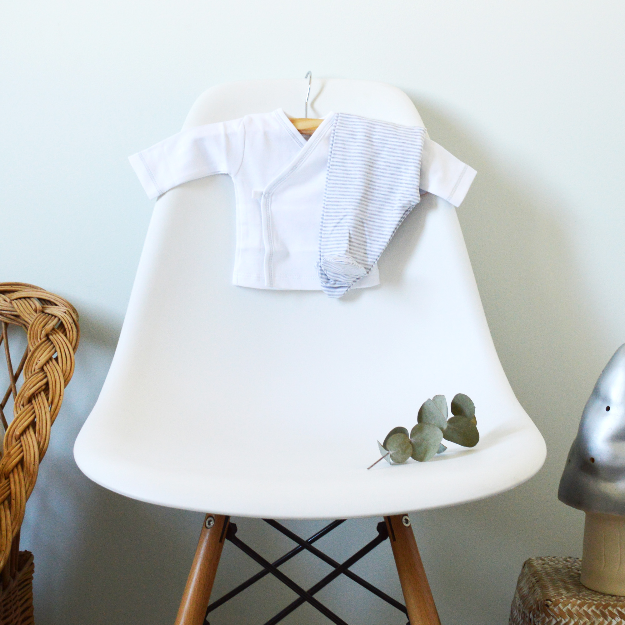 * cache-cœur blanc bordure grise et son pantalon banc rayures grises en coton pima