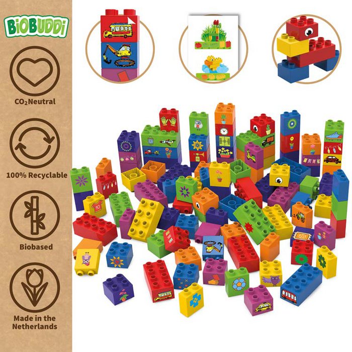 Des jouets écologiques 100% fabriqués aux Pays-Bas avec les parties non utilisables de la canne à sucre. Des jouets durables et recyclables à 100% pour la sécurité de nos enfants. Des blocs de construction colorés pour créer, apprendre et s’amuser.