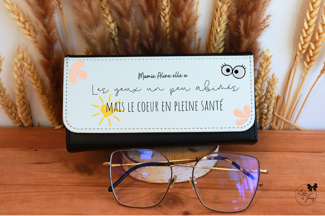 Faites sourire votre Mamie avec cette boîte à lunettes personnalisée, portant une tendre et joyeuse inscription : “Mamie [Prénom], elle a les yeux un peu abîmés mais le cœur en pleine santé” 💖.