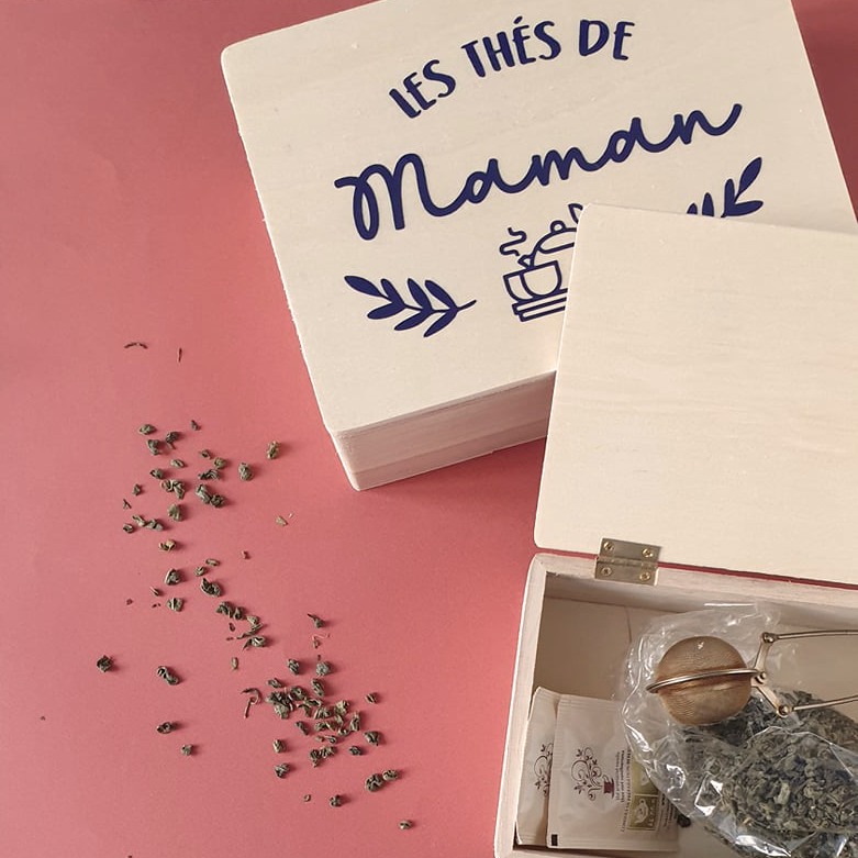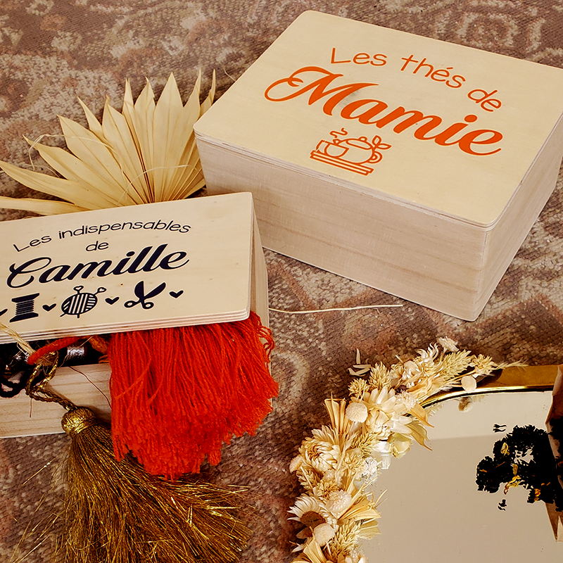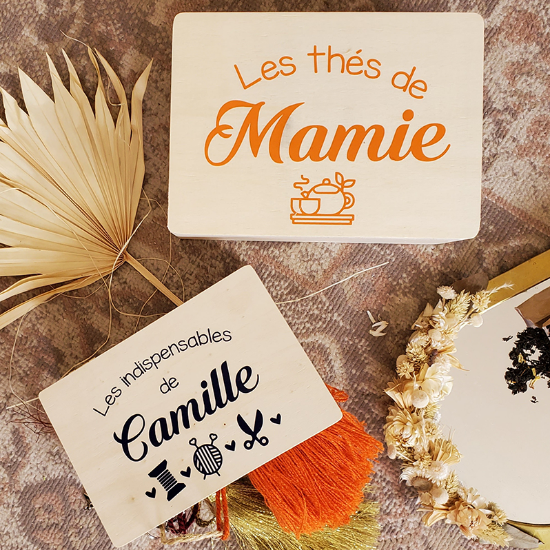 8Boite personnalisée en bois pour y ranger tout ce que vous souhaitez. Elle peut contenir tous vos trésors : sachets de thés, barrettes & chouchous, essentiels de couture… Bref, cadeau pratique pour un budget léger !