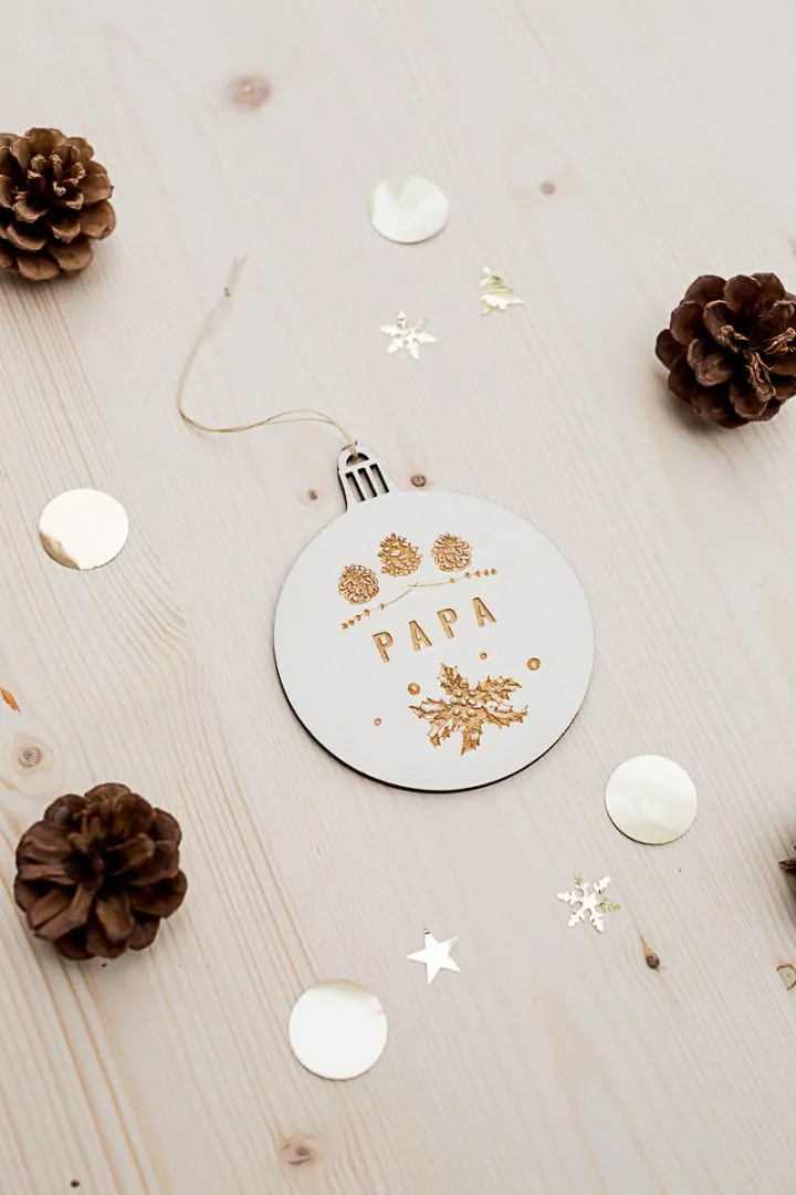 HoHoHo voici le temps de Noël qui approche et la décoration du sapin pour embellir sa maison pendant ce temps de fêtes ! Notre boule de Noël « Papa » est un chaleureux symbole en cette fin d’année mais aussi une idée cadeau pour des nouveaux parents qui fêtent leur premier Noël. Dimension : 9cm de diamètre Matière : bois peuplier Délai de fabrication : 48H en semaine Délai de livraison : 72H en lettre suivie
