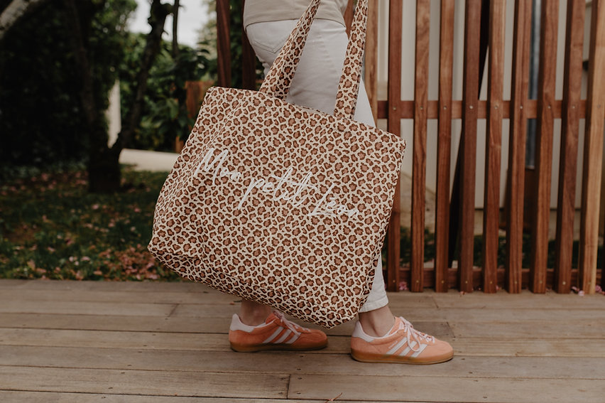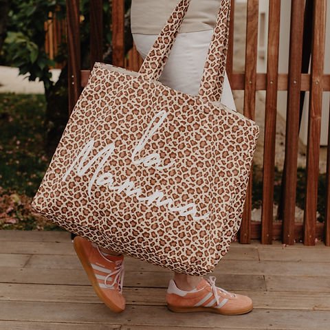 Imprimé léopard avec inscription en sérigraphie blanche « la Mamma » au recto et « Mon petit Léon » au verso