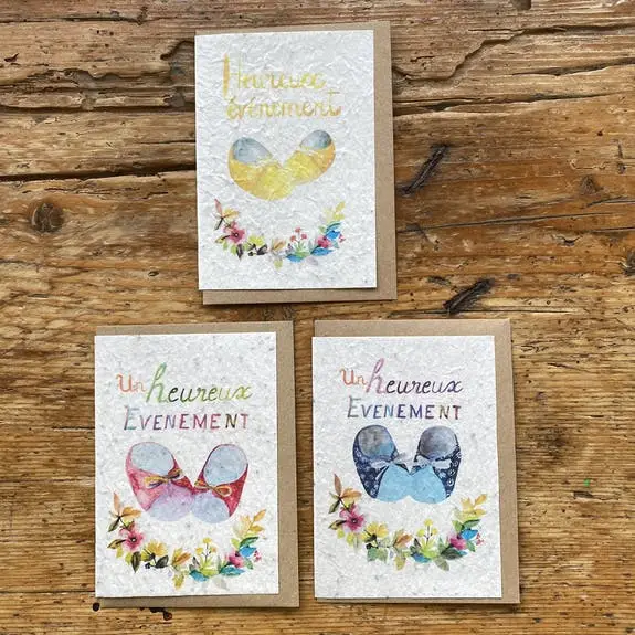 Une fois lues et appréciées par leur destinataire, mes cartes peuvent être plantées. En effet, elles sont en papier biodégradable rempli de petites graines (non traitées !).
