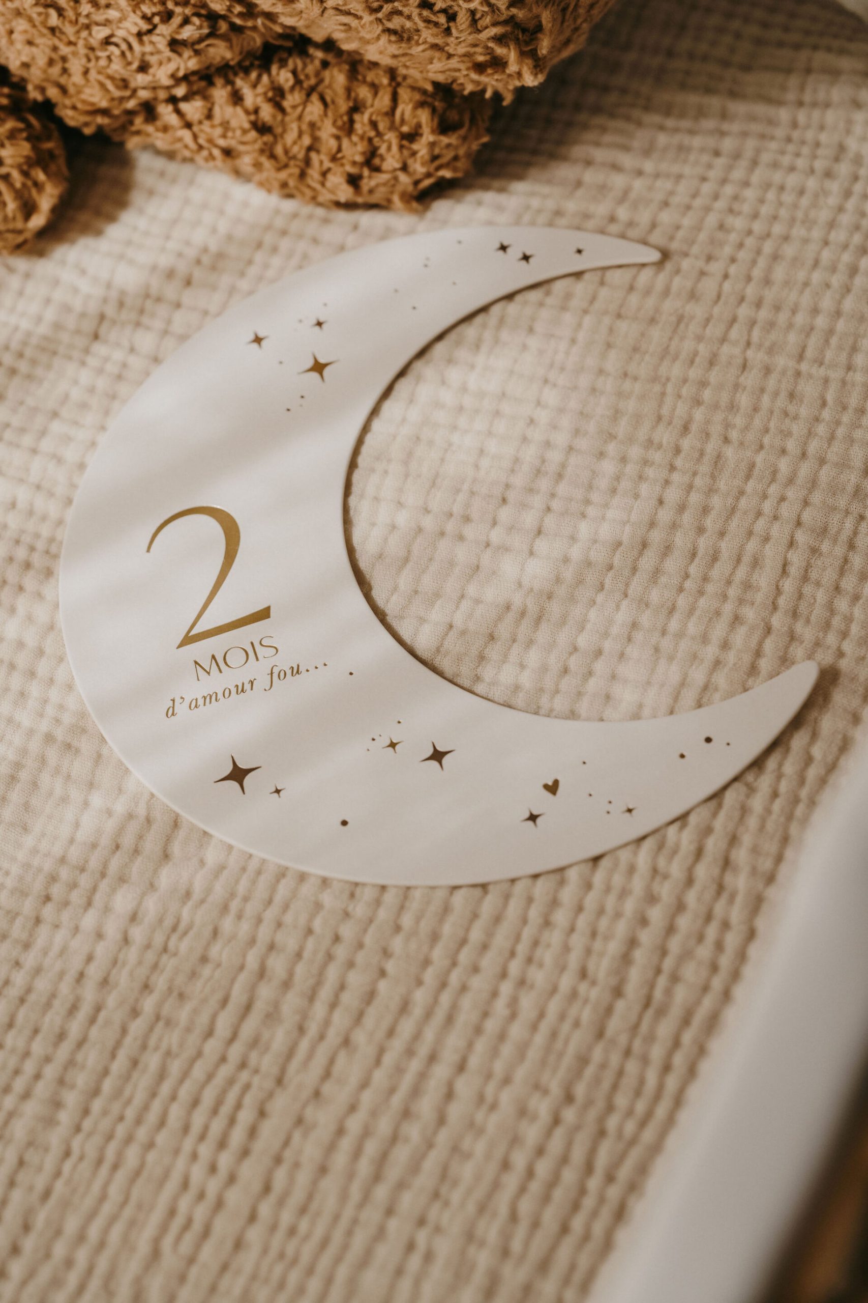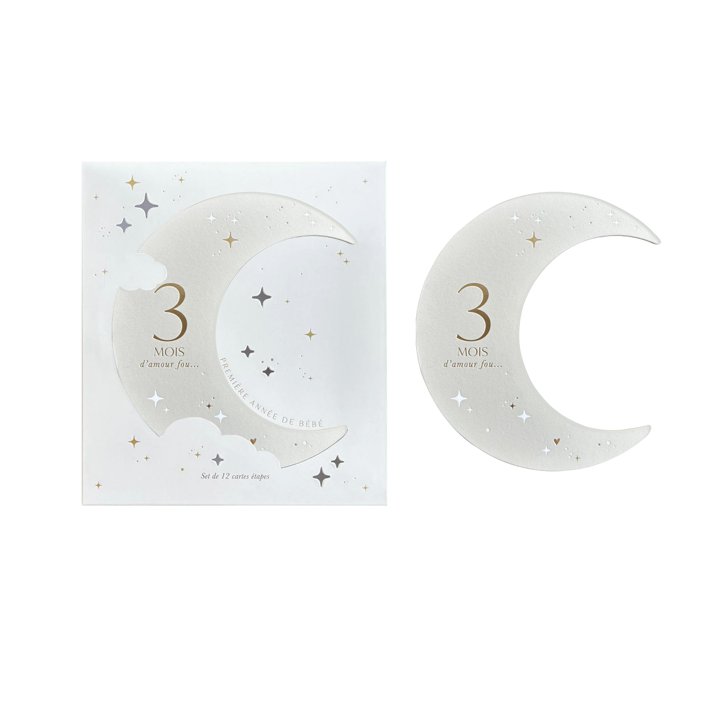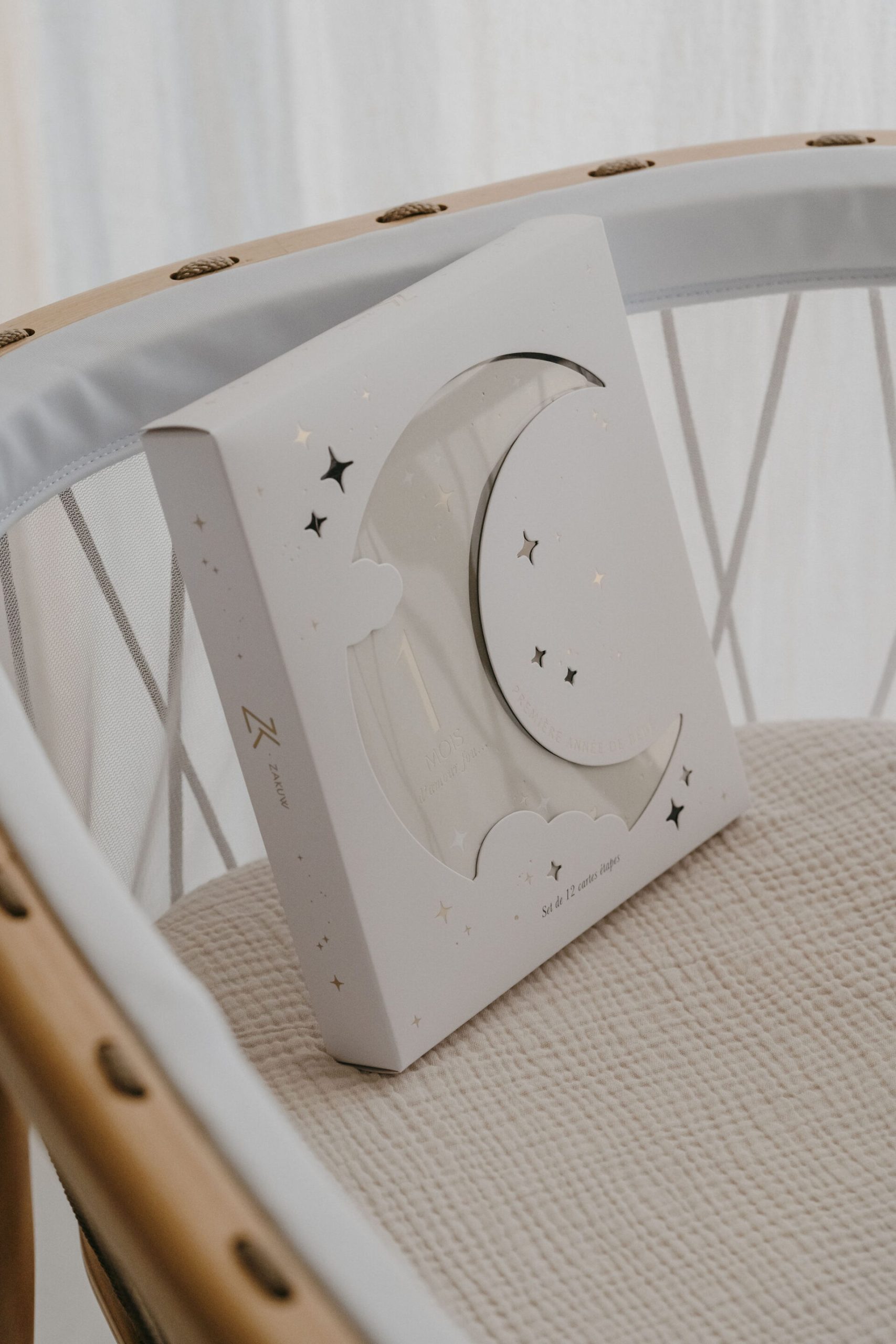 Immortalisez la première année de votre bébé avec le coffret de cartes étapes Moon. Composé de 12 cartes étapes au design poétique, ce coffret vous permettra de prendre de superbes photos souvenirs et d’annoter au dos l’évolution de bébé mois après mois !