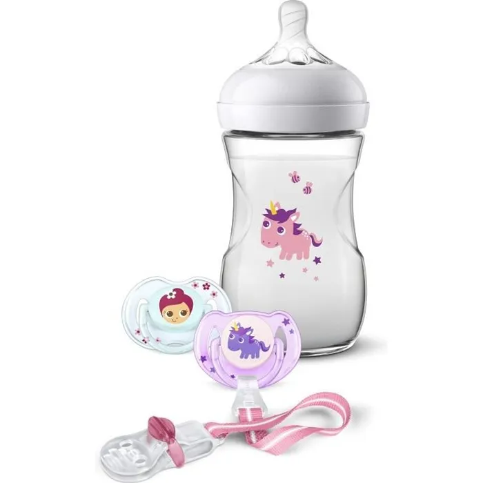 Coffret Biberon Philips Avent Natural 260ml + 2 Sucettes + Attache-Sucette, Motif Licorne