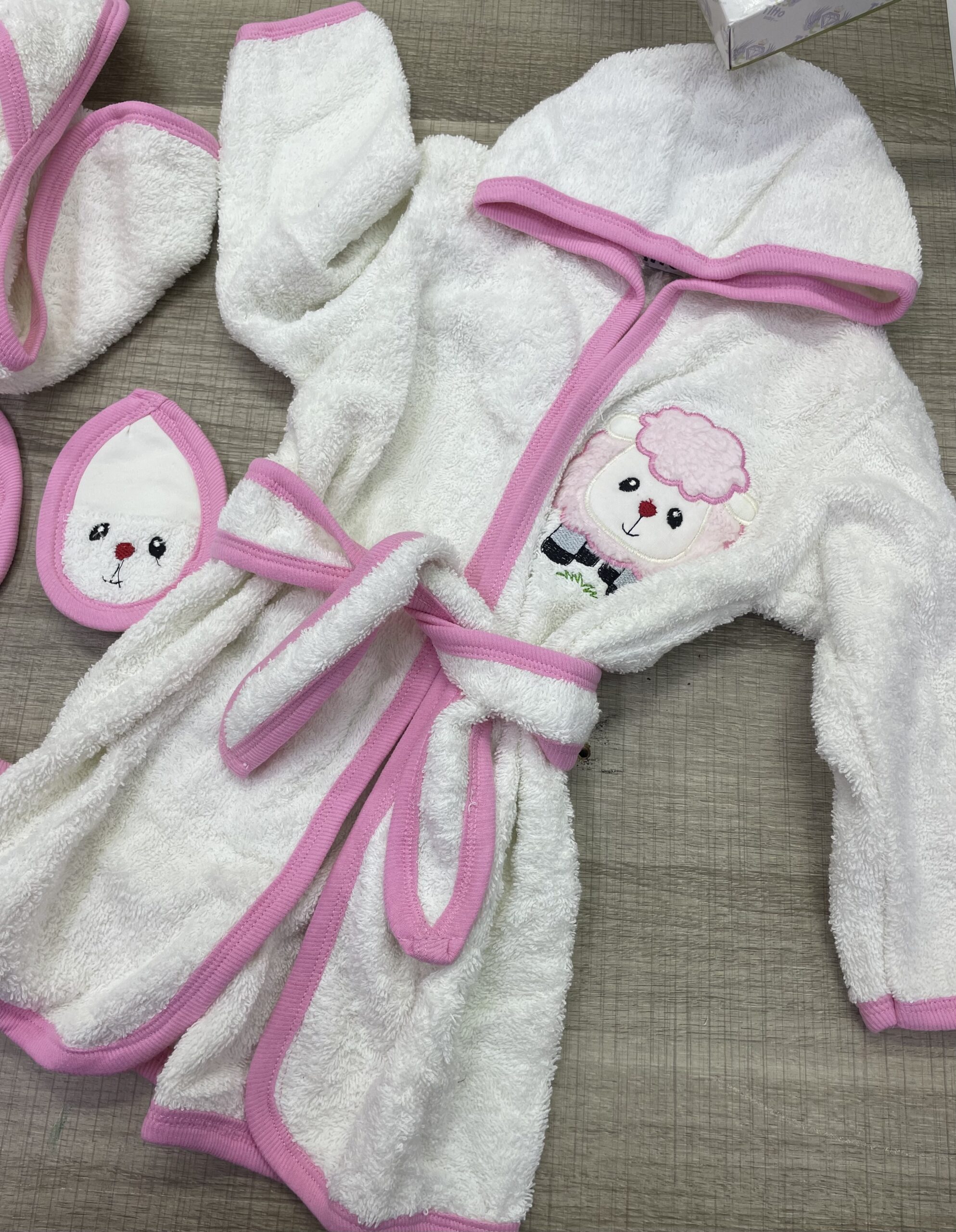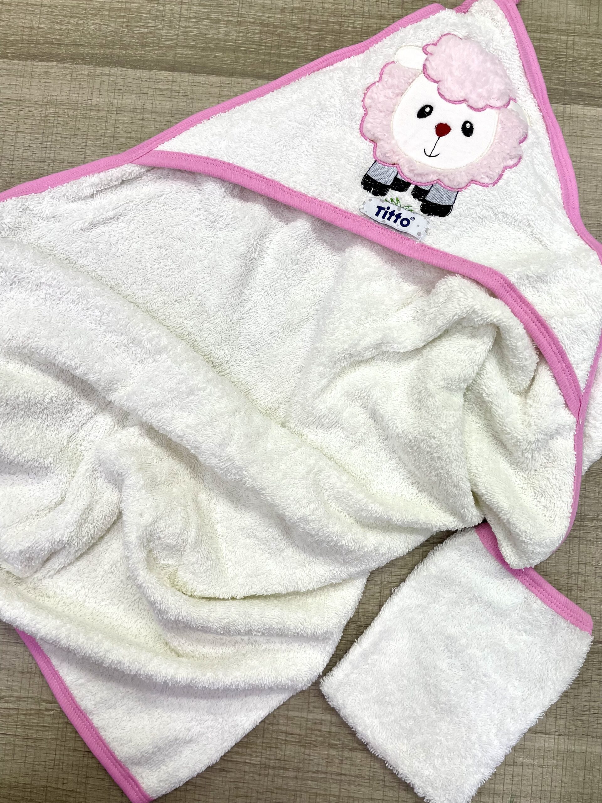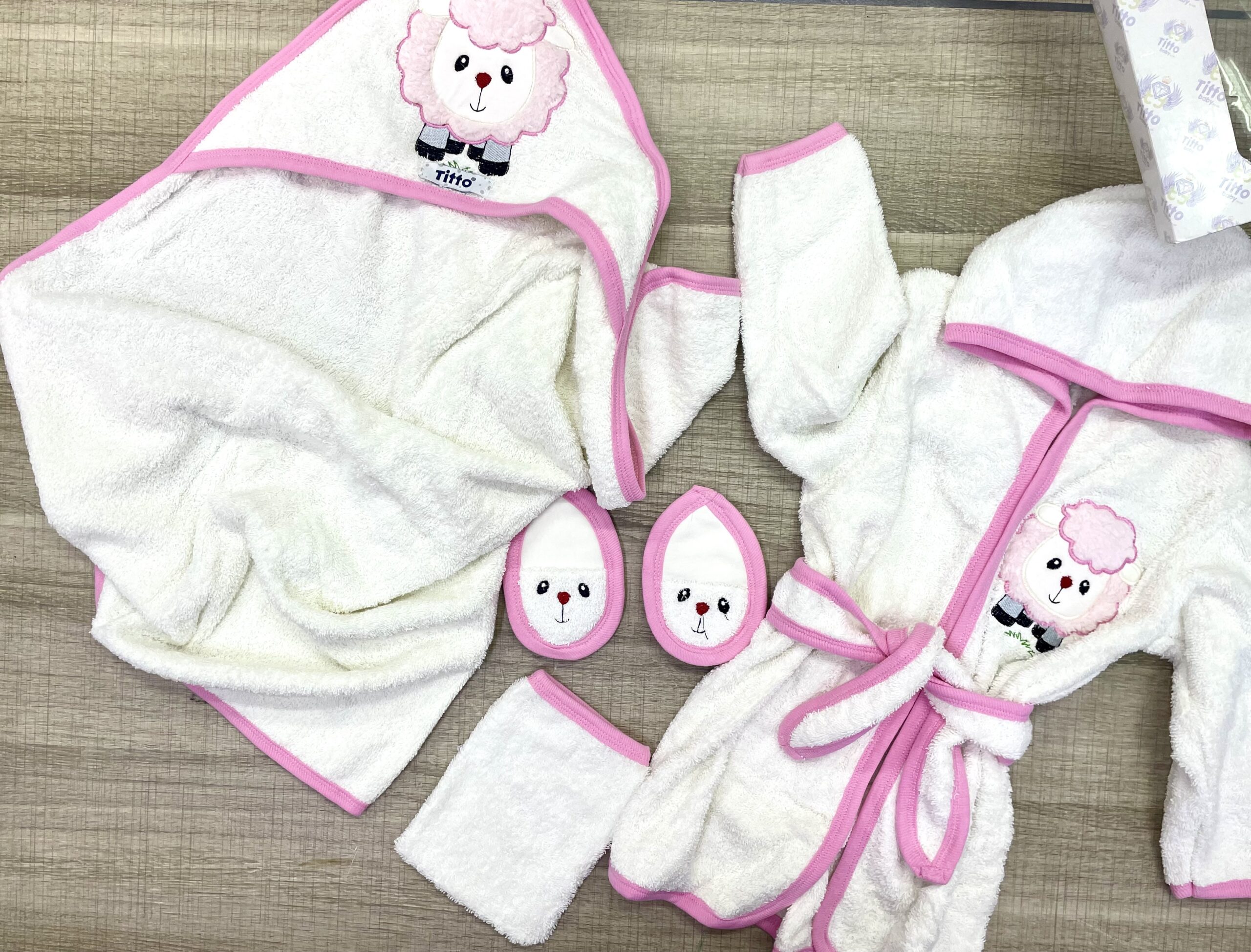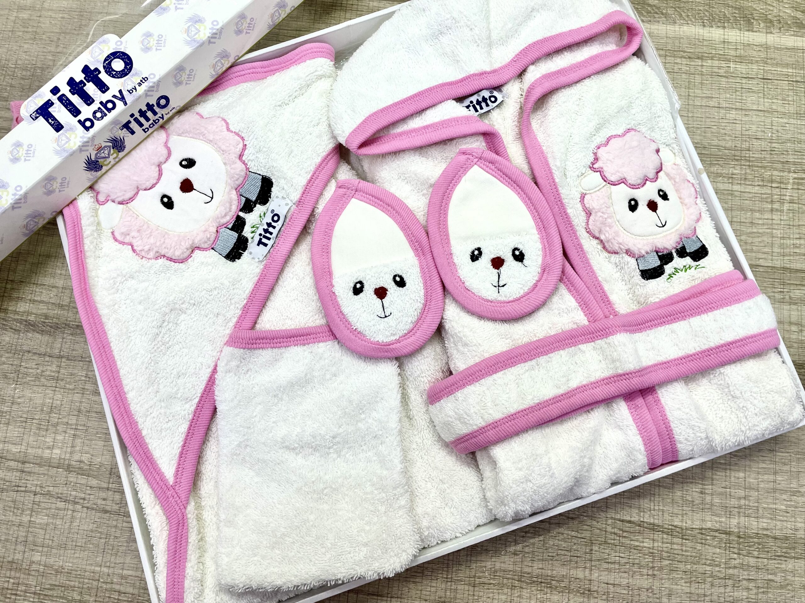 Coffret de bain TITTO pour accompagner votre bébé dès ces premiers bains , composé de 4 pièces: – cape de bain : de 0 a 12 mois – Un sortie de bain : de 1 an jusqu’à 3 ans – Un gant de toilette – Des babouches de bain