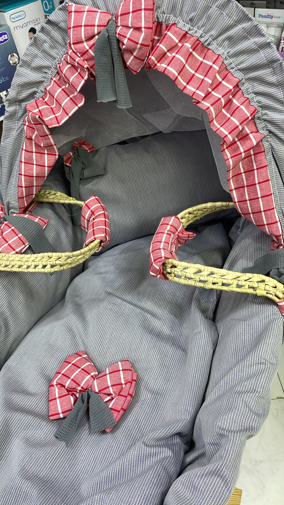 Le tressage du panier est en feuille de palmier naturelle. Le tissu est tendu manuellement sur chaque couffin pour en épouser parfaitement les formes