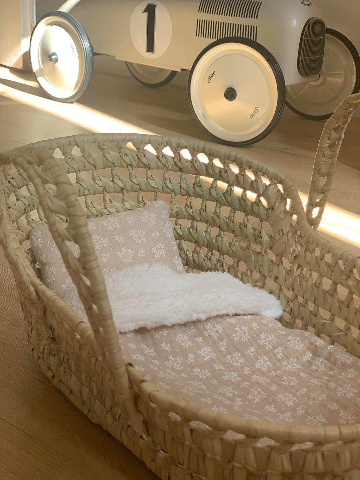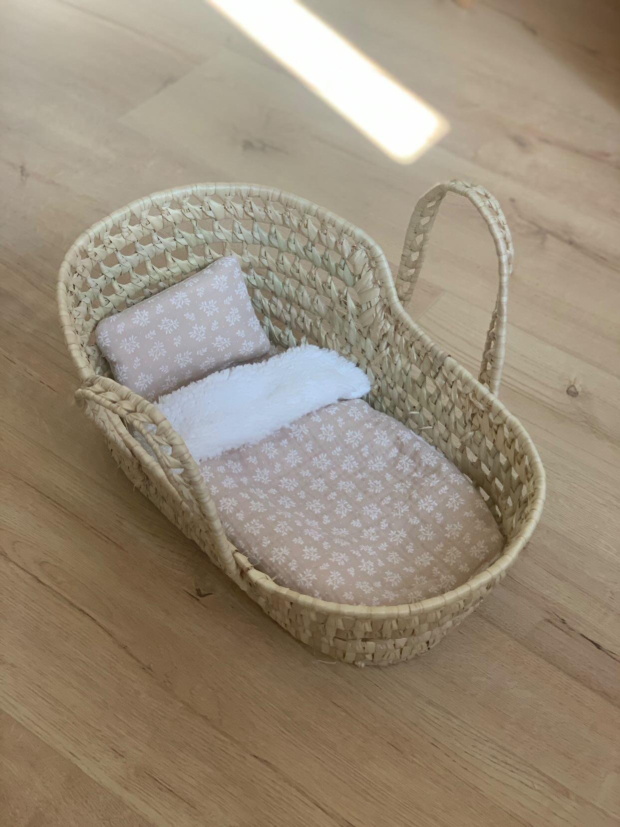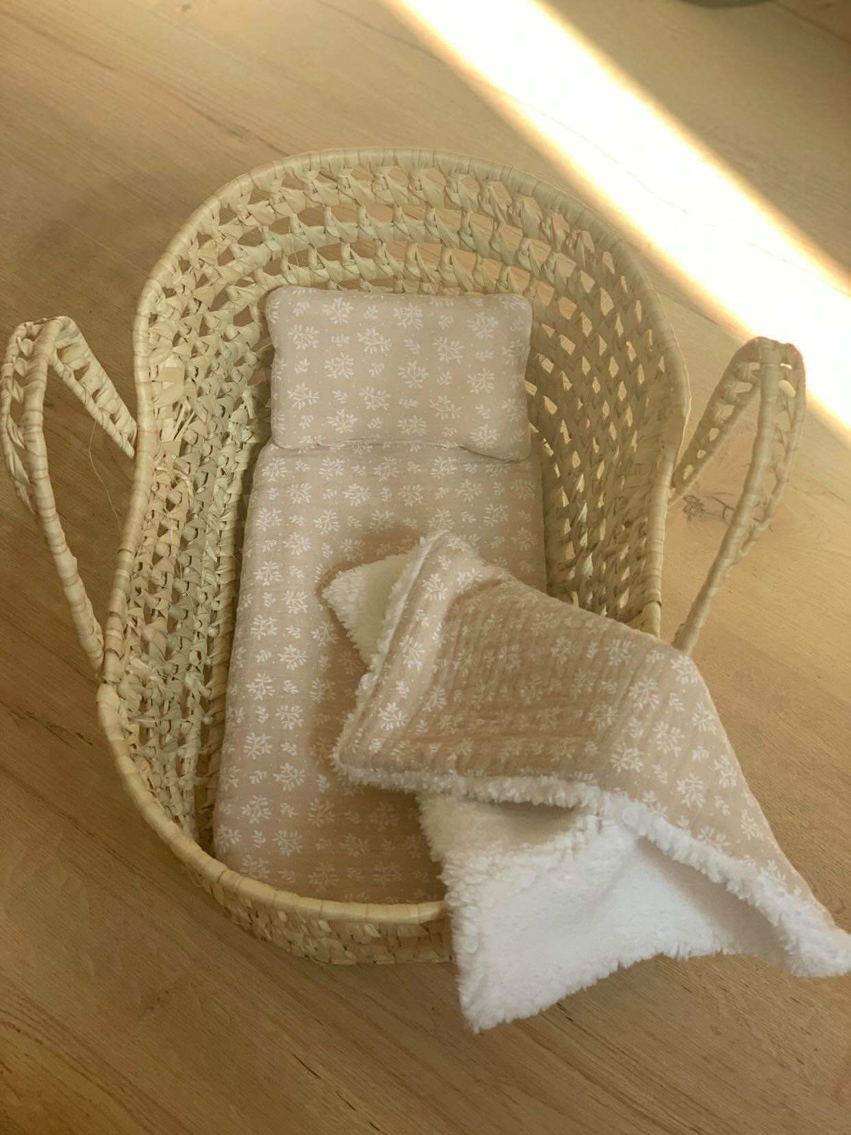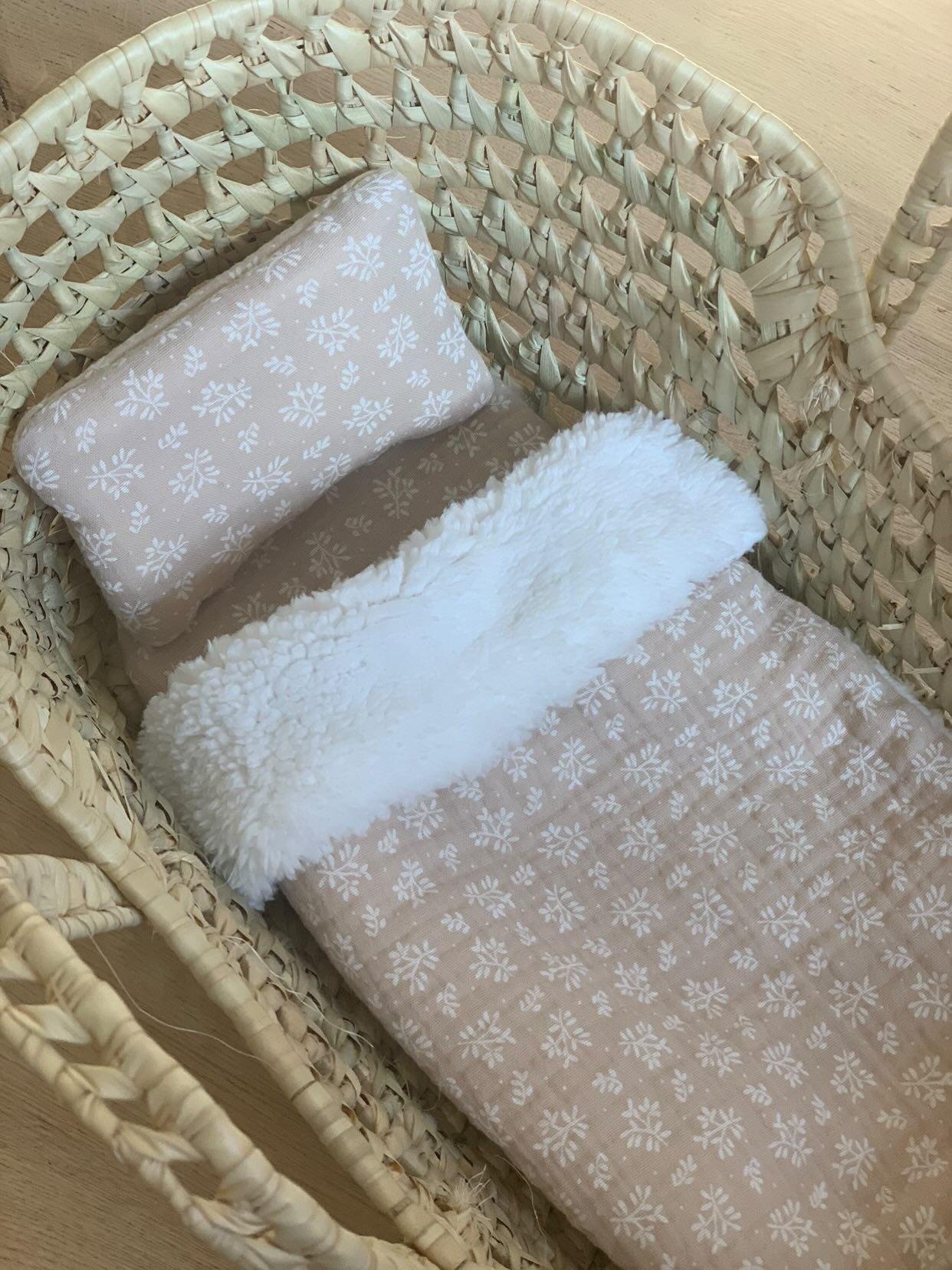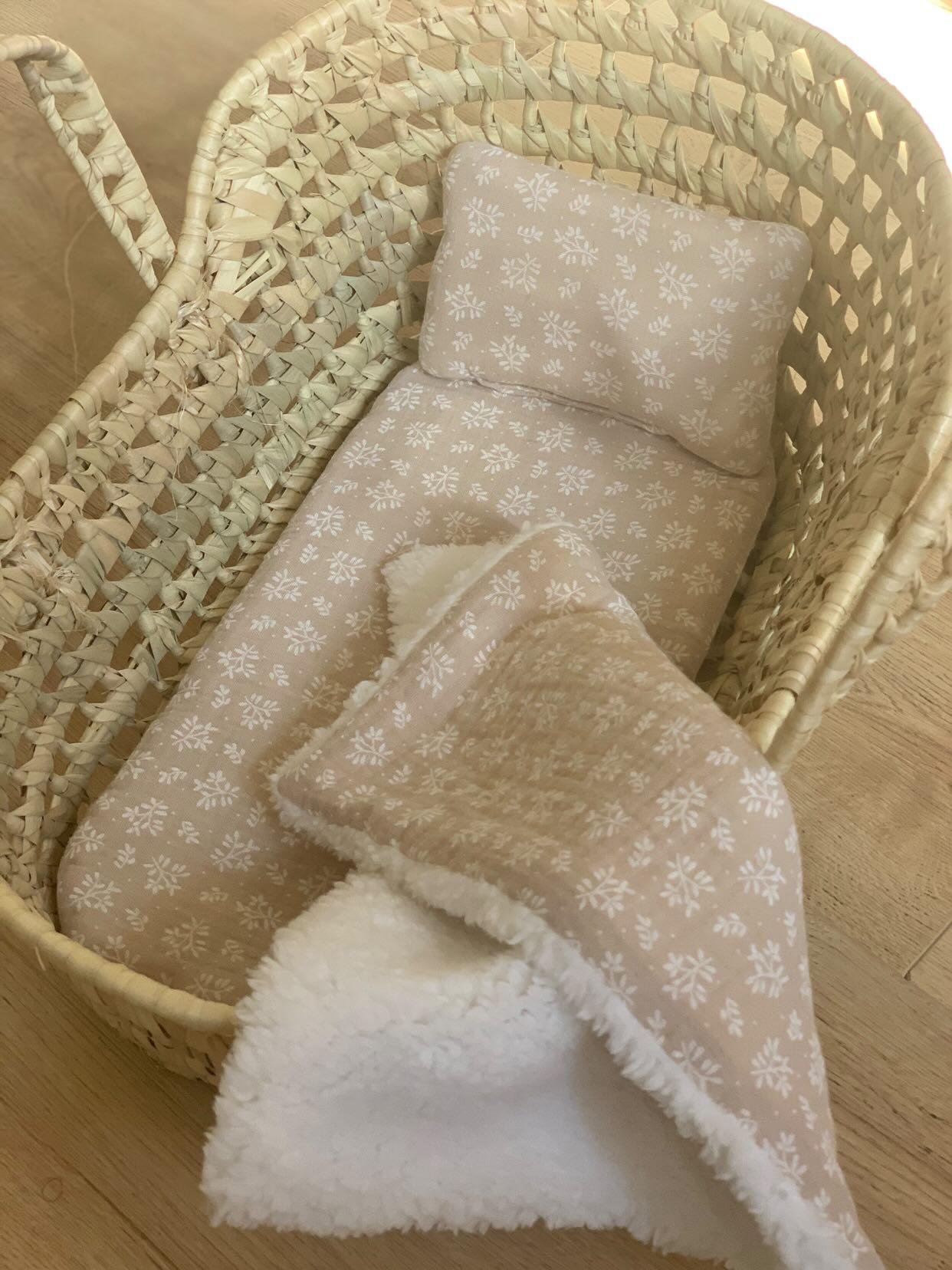 Couffin pour poupée avec sa literie fait main – Feuillage Beige