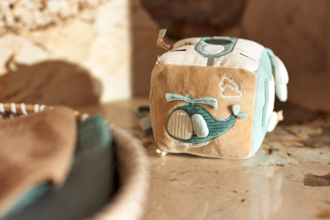 Dans les couleurs vives sea Green et Biscuit, ce cube offre un monde de découvertes. Vous y trouverez une adorable clé avec un bruit de craquement, un imprimé de pompe à essence et un feu de signalisation avec un miroir pour que votre petit s’émerveille.