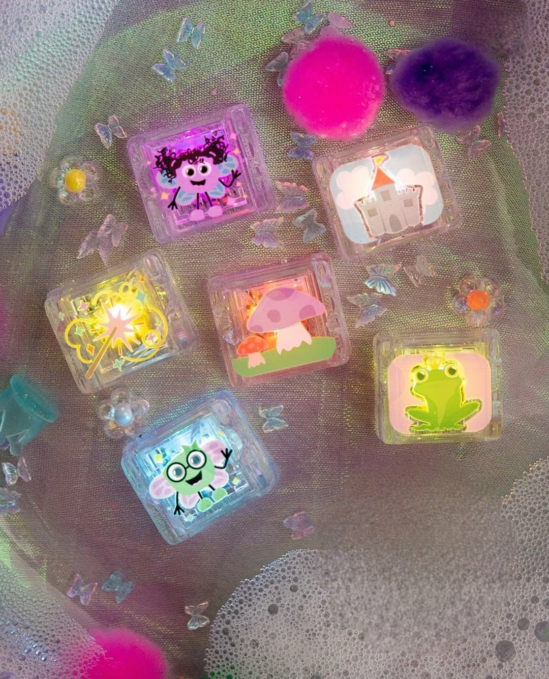 Chaque cube possède un motif différent pour stimuler la curiosité et encourager le jeu libre : grenouille, fée, champignon, château, baguette magique… Réutilisables et faciles à manipuler, ils accompagnent les enfants dans leurs moments de bain ou d’activités sensorielles.