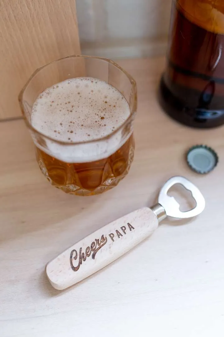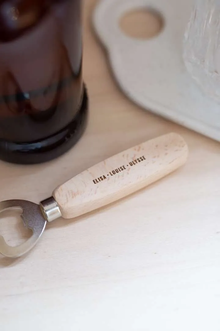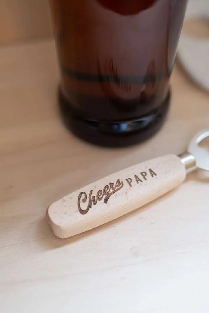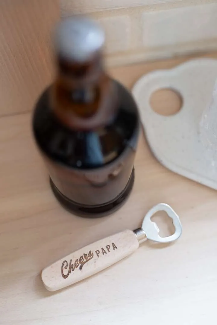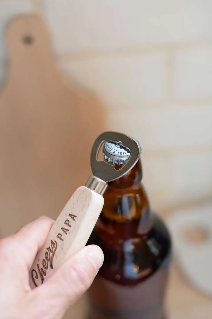 Décapsuleur en bois avec une gravure « Cheers PAPA » a personnaliser au verso avec le ou les prénoms vos enfants.