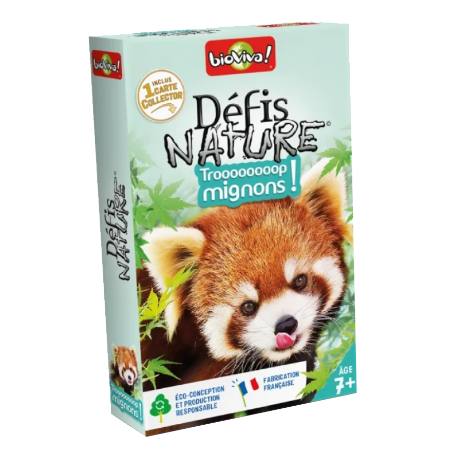 De 2 à 6 joueurs. Dès 7 ans. Durée d’une partie : 20 min. Fabriqué en France et éco-conçu. Défis Nature – Trop mignons ! vous emmène à la rencontre d’animaux beaucoup trop mignons ! Découvrez leurs caractéristiques, puis pariez sur leurs points forts pour remporter la partie. Alors, prêts à relever le défi ?
