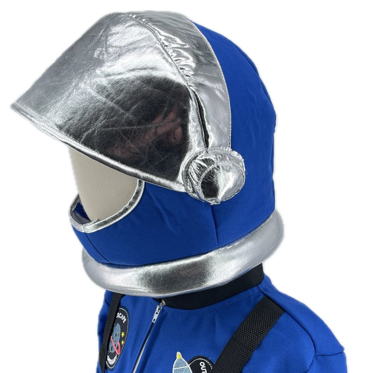 Neil, la combinaison de cosmonaute bleue, avec impression de badges, fermeture par zip et casque de cosmonaute en mousse.