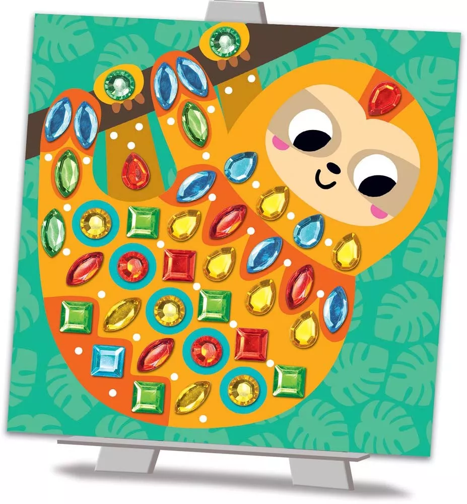 6 tableaux animaux, 281 pierres colorées autocollantes, un chevalet de présentation et une notice modèle.