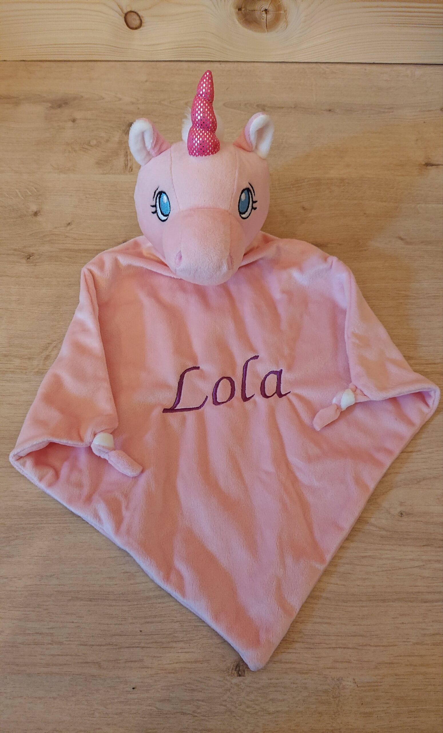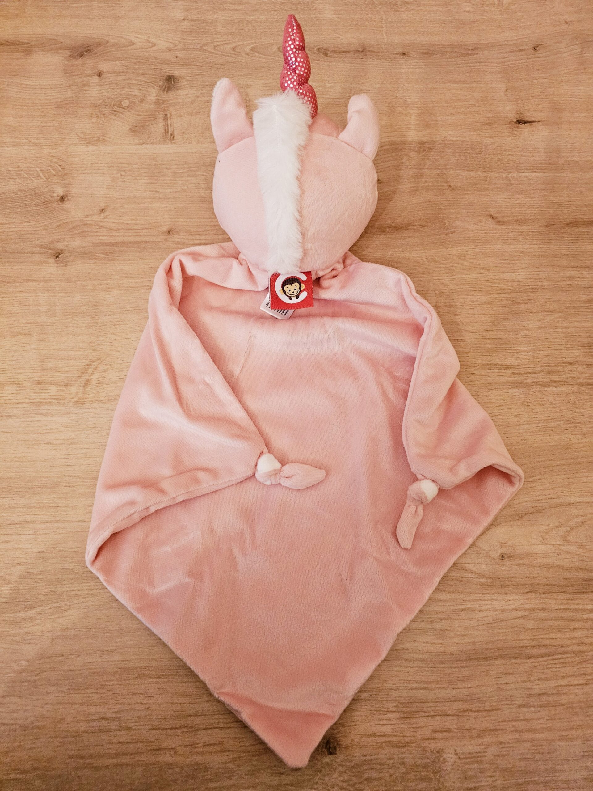Nous vous présentons notre nouvelle petite Licorne Rose sous forme de doudou plat.