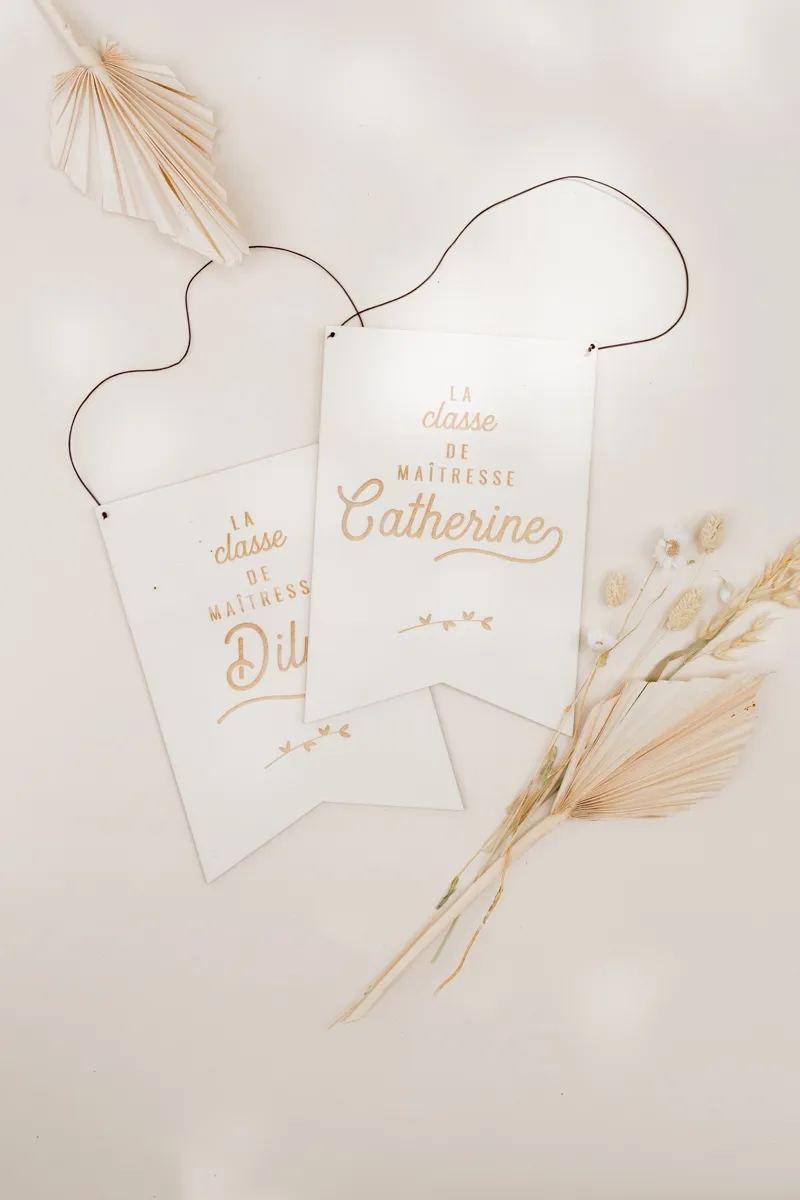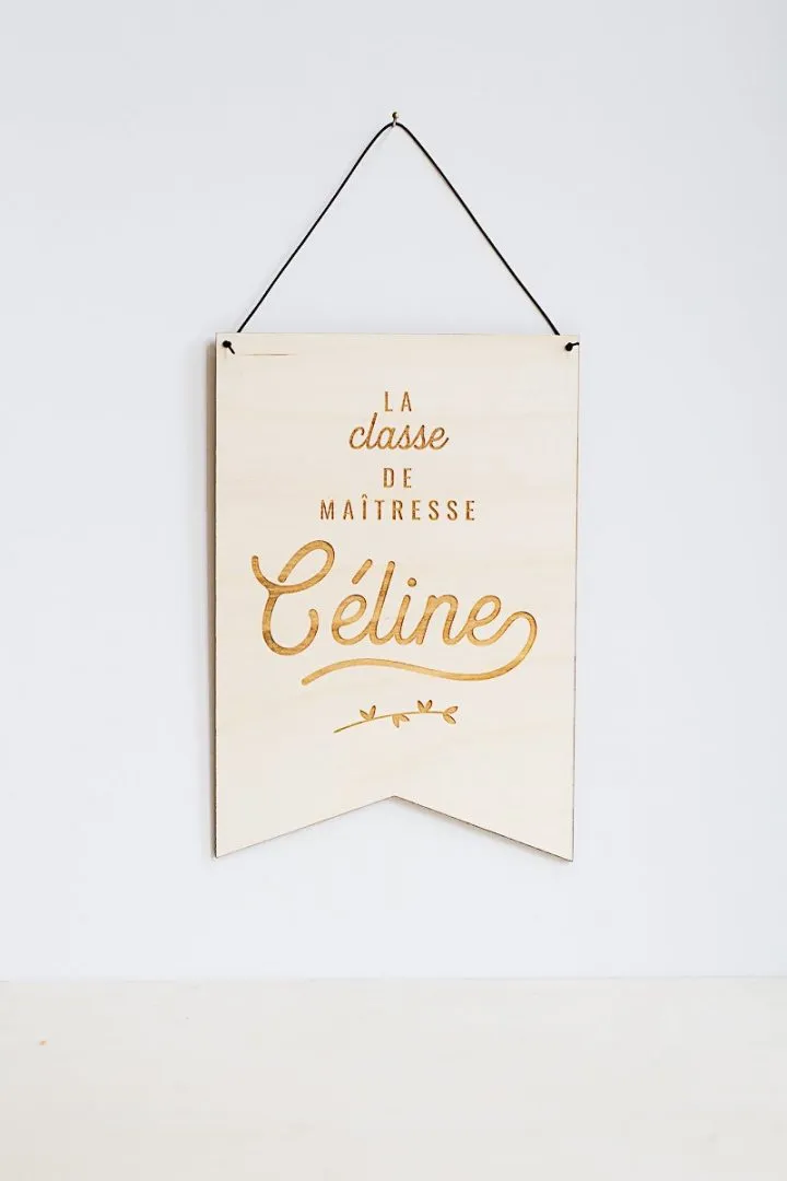 Petit étendard en bois afin que la maitresse de votre enfant annonce joliment où se trouve sa classe dans l’école ! Un cadeau original à offrir en fin d’année scolaire ! Existe aussi en version maître. Dim : 16x21cm cm Matière : bois de peuplier – 4mm d’épaisseur – ficelle de cuir Délai de fabrication : 4 jours ouvrés Délai de livraison : 48h en lcolissimo