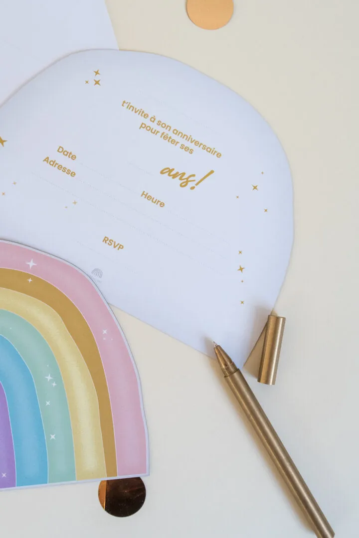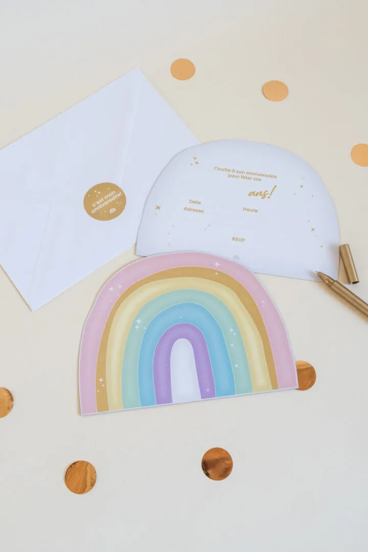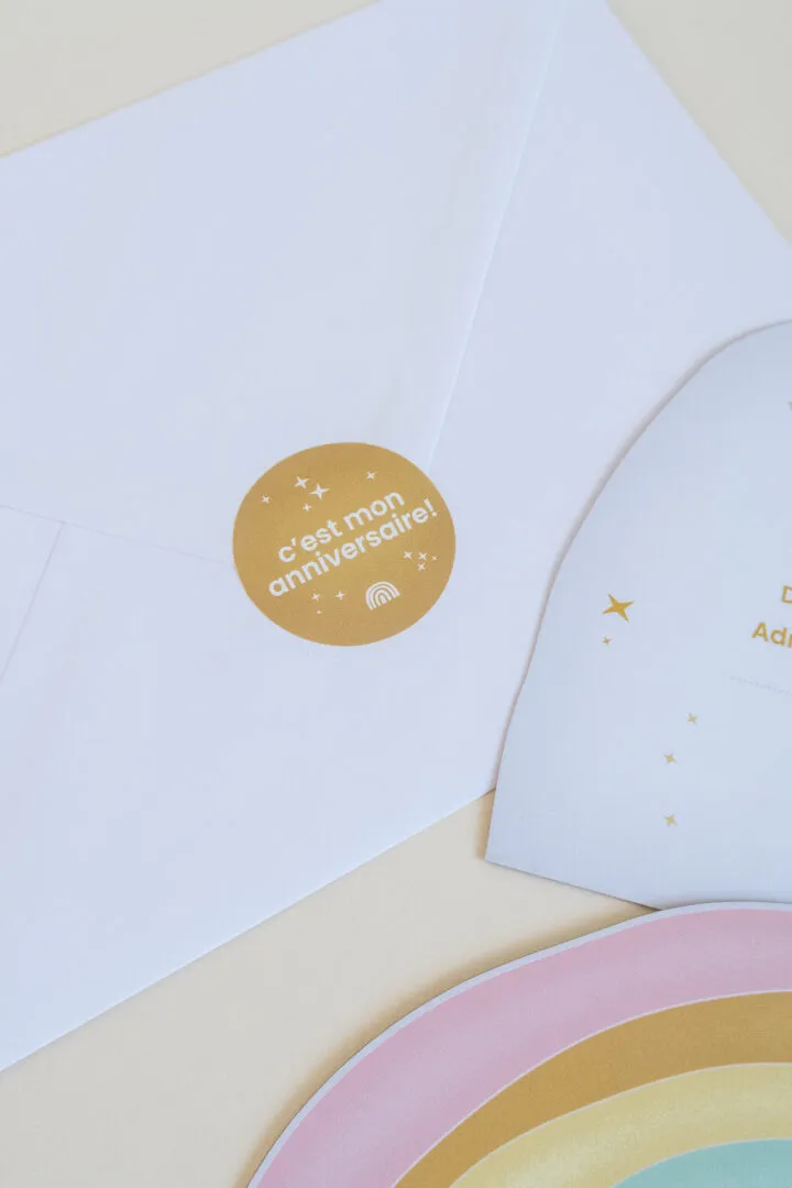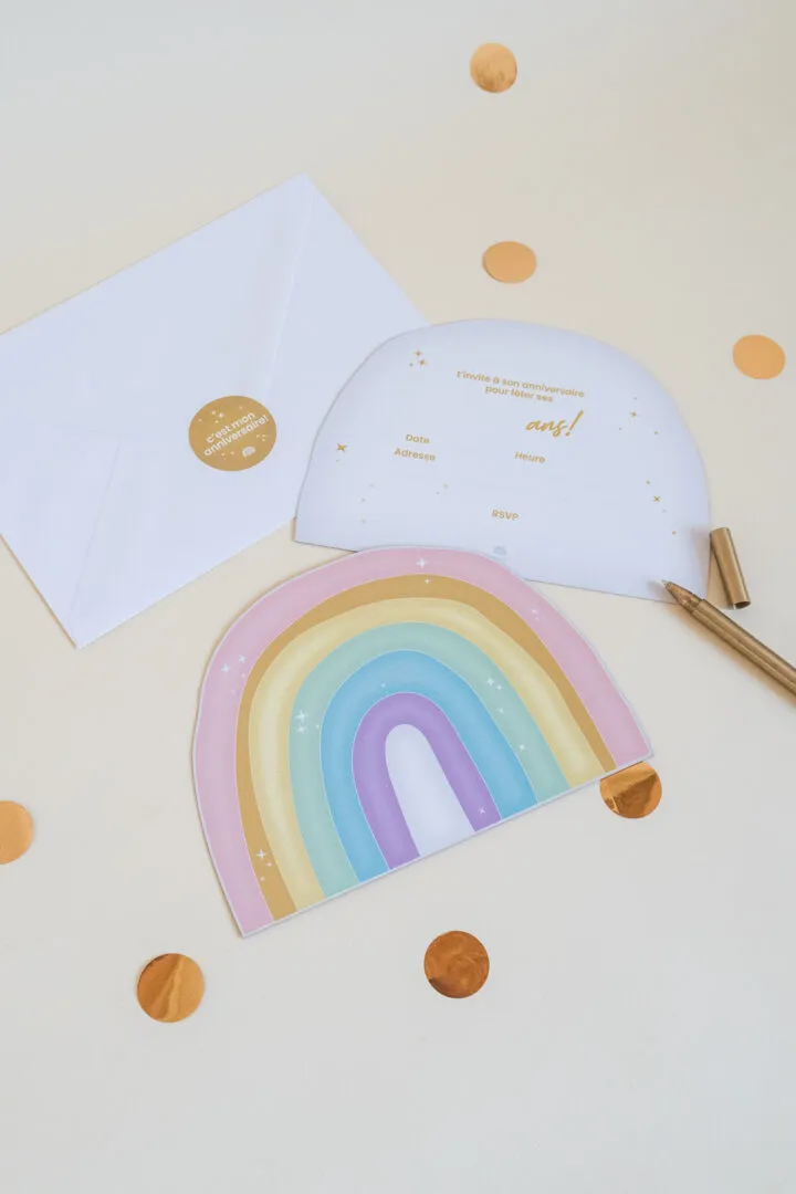 Lot de 5 faire-part avec enveloppes et stickers. Impression recto-verso Papier 300g / Découpe laser Format : 18.5×13.5cm (faire-part) 22×15.5cm (enveloppe)