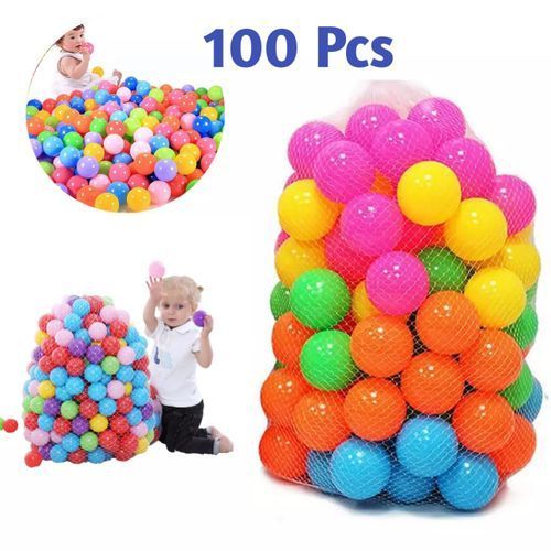 Filet de 100 balles en plastique souple. Ideal pour les parcs de bébé, à la salle de bain, piscine, ou pour les créches. Les enfants vont adorer sa forme souple pour jouer dans le jardin et apprendre les couleurs.