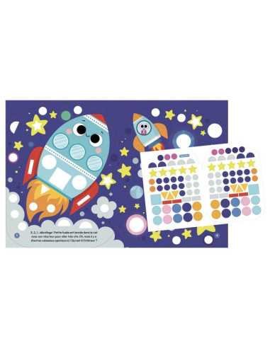 Un cahier de plus de 300 gommettes de formes géométriques, qui servent à compléter l’histoire de petite fusée, à travers un cahier de décors détachable.