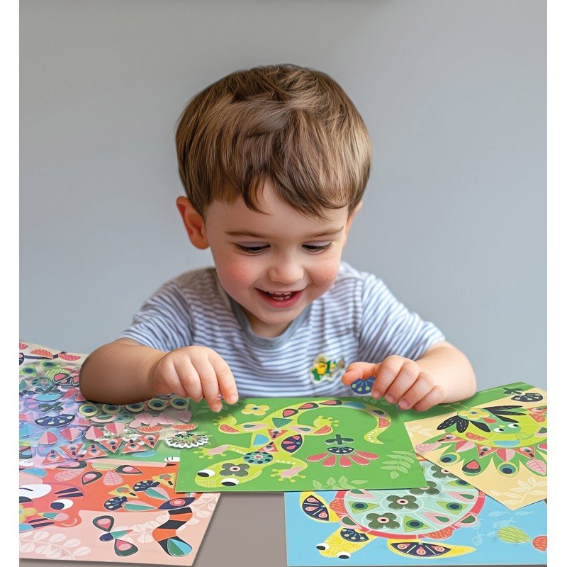 Contenu 6 grandes cartes à décorer (un éléphant, un tigre, un paon, une tortue et une salamandre), 6 planches de gommettes repositionnables, une notice et un chevalet.