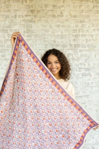 “Le block-print est une tradition ancestrale indienne, soigneusement préservée et pratiquée par des artisans en Inde qui consiste à imprimer des motifs dans un bloc de bois, sur du coton, du lin ou de la soie en exerçant une pression de la main sur le bloc”.