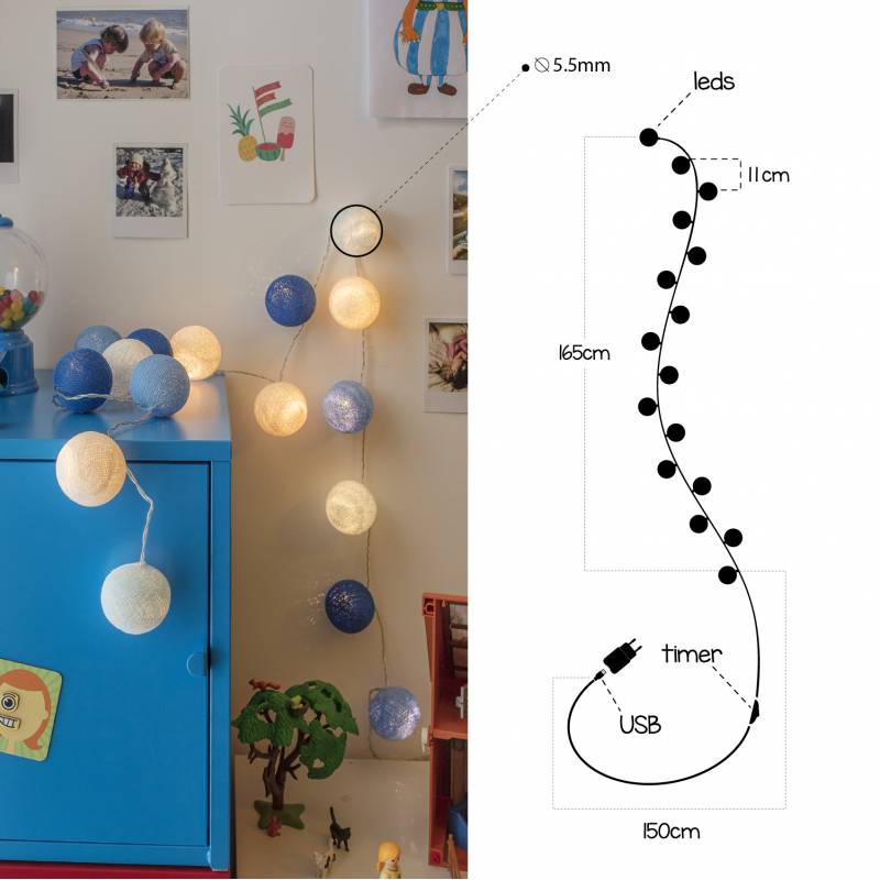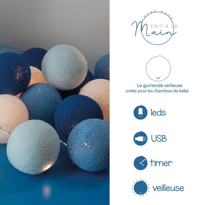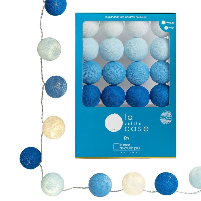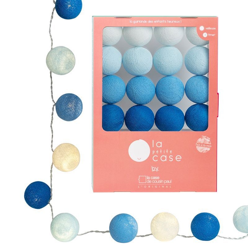 Découvrez ce coffret guirlande pour bébé 16 boules Lucien de la collection La petite case de la marque la case de cousin Paul. Dans ce coffret vous trouverez tout le nécessaire pour créer une guirlande lumineuse bleue à votre petit bout. Le coffret comprend une guirlande de 16 ampoules LED ainsi que 16 boules pré-coupées de différentes couleurs et un transformateur USB.