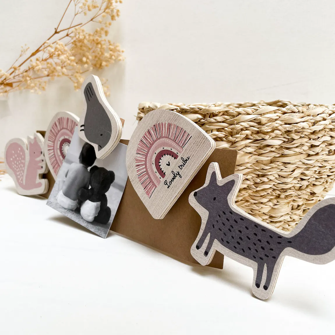 Guirlande porte photos ou message en bois à motif arc en ciel et animaux.