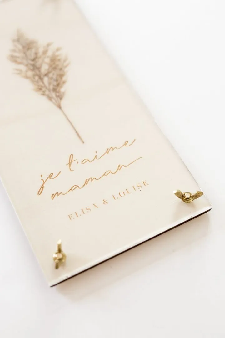Herbier décoratif avec une gravure « je t’aime maman » et le prénom de votre.vos enfant.s . Joli objet décoratif à poser sur un bureau, une coiffeuse, un petit coin à soin. Le cadeau délicat et attentionné parfait pour une fête des mamans ! Nous proposons l’herbier avec une herbe de pampa séchée mais vous pouvez facilement changer par une fleur de votre choix grâce à ses visseries en laiton au quatre coins du cadre. Matériau : bois, plexiglas, laiton, fleur de pampa séchée Dimension : 11x23cm Fabrication : 48H Livraison : 48h en colissimo