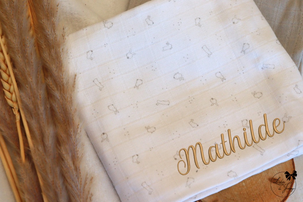 La broderie se place dans un coin du lange, pour un rendu discret mais élégant. Grâce à ce soin apporté aux détails, chaque lange devient une pièce unique, créée spécialement pour vous. De plus, j’utilise des fils de qualité pour assurer une tenue parfaite lavage après lavage.