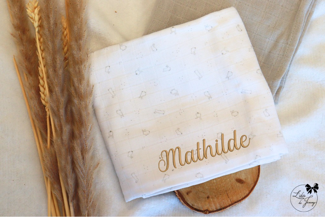 Lange en gaze de coton, doux et absorbant, brodé au prénom de bébé. Plusieurs coloris disponibles, police et fil personnalisables. Un cadeau pratique et unique !