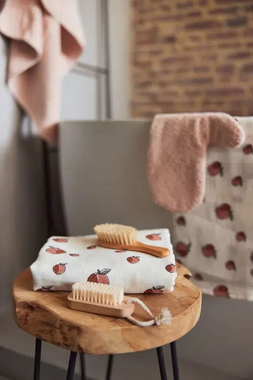 Disponible en pêche avec un fond rose et en poire avec un fond caramel. Il existe également des serviettes hydrophiles dans d’autres imprimés.