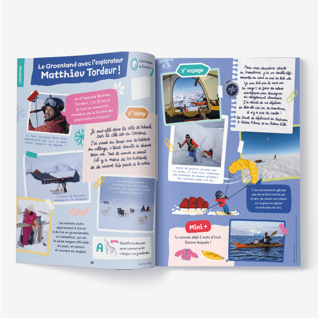 Oscar et Sacha se rendent au Groenland ! Dans ce numéro vos enfants vont découvrir la vie incroyable des habitants du Groenland, la beauté des fjords et des animaux arctiques, et faire la connaissance d’un véritable aventurier 😍 Un magazine pour enfants de 40 pages, adapté à l’âge de tous avec : une maxi chasse aux trésors, des histoires, des jeux, des initiations linguistiques, des coloriages, du bricolage et plein de gommettes… Du contenu fun et pédagogique conçu avec des instits, des familles sur place, et une super équipe édito en interne pour apprendre en s’amusant.
