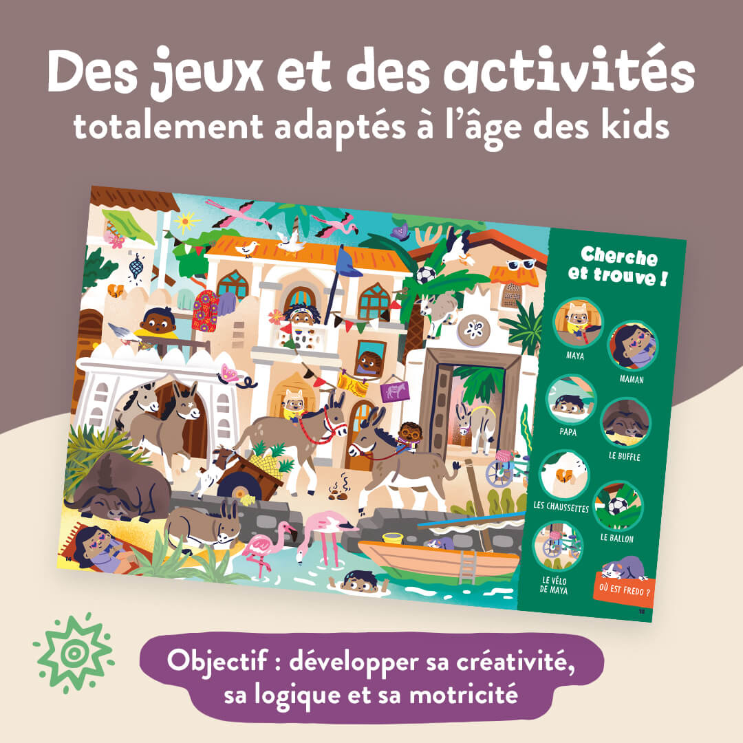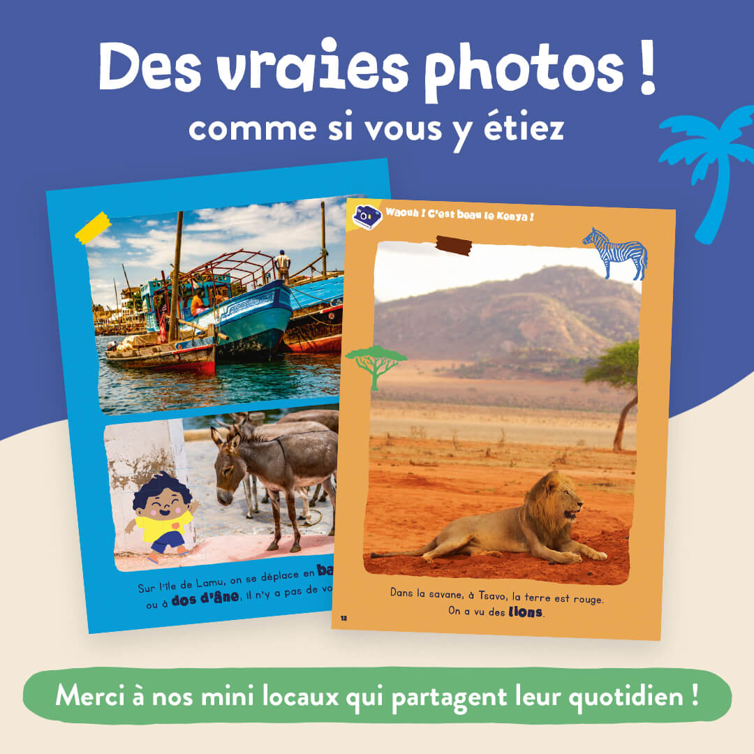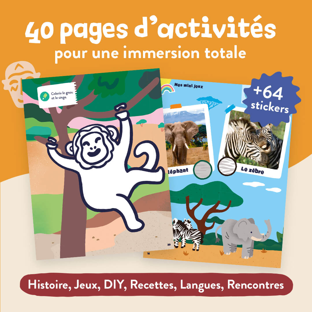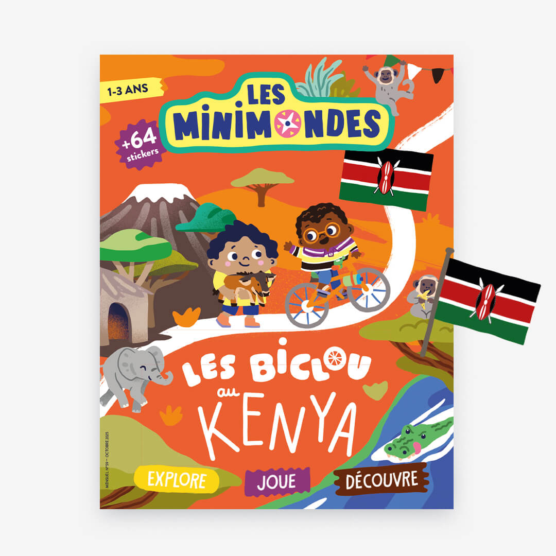 Cap sur le Kenya ! Dans ce numéro à l’unité, vos enfants vont pouvoir suivre les aventures de la petite famille Biclou, qui parcourt le monde à vélo. Une initiation au voyage, tout en douceur. Un magazine pour enfants d’une trentaine de pages, adapté à l’âge de vos enfants avec : des histoires, des jeux, des photos, des coloriages, du bricolage et plein de gommettes (+ de 55 stickers !)… Du contenu fun et pédagogique conçu avec des instits, des familles sur place, et une super équipe édito en interne pour apprendre en s’amusant. Au programme de ce numéro tu…