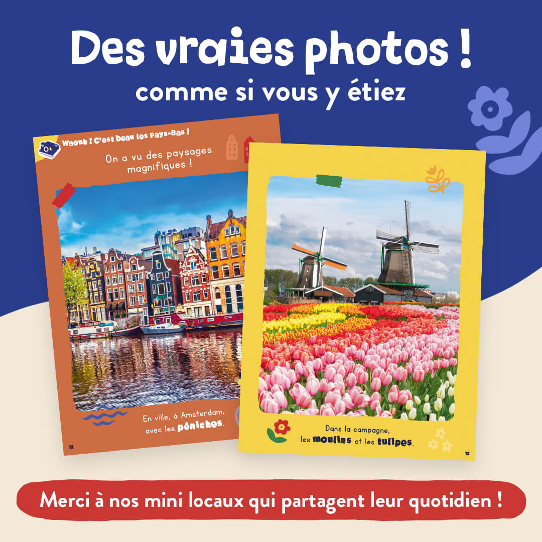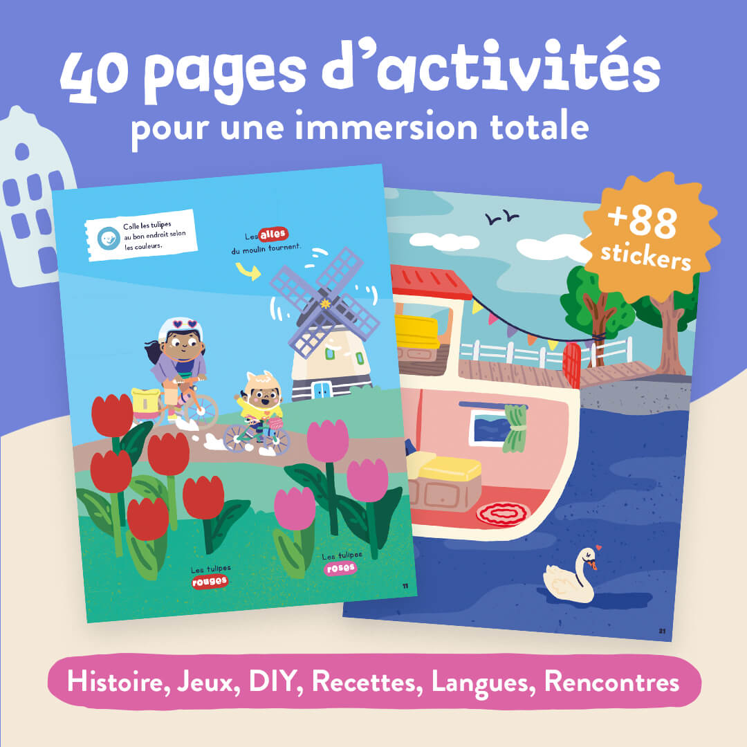 Cap sur les Pays-Bas ! Dans ce numéro à l’unité, vos enfants vont pouvoir suivre les aventures de la petite famille Biclou, qui parcourt le monde à vélo. Une initiation au voyage, tout en douceur. Un magazine pour enfants d’une trentaine de pages, adapté à l’âge de vos enfants avec : des histoires, des jeux, des photos, des coloriages, du bricolage et plein de gommettes (+ de 55 stickers !)… Du contenu fun et pédagogique conçu avec des instits, des familles sur place, et une super équipe édito en interne pour apprendre en s’amusant. Au programme de ce numéro tu…