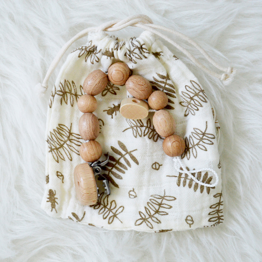 + 1 attache tétine en bois naturel et cire d’abeille avec sa pochette pour le transport en coton bio