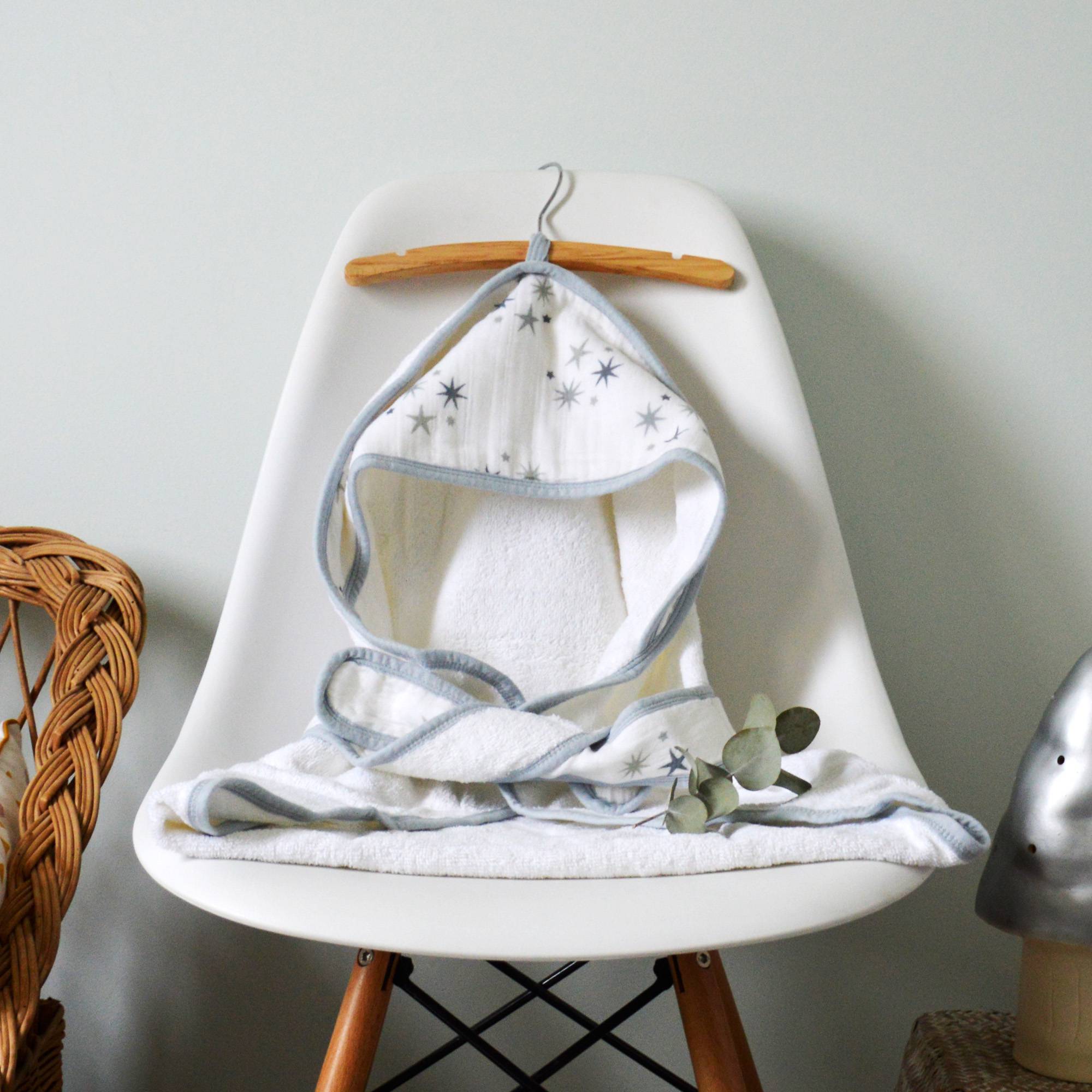 + 1 couverture de bain à étoiles grises ~ lien permettant de fermer la couverture à la sortie du bain