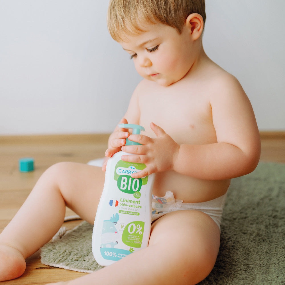 Le liniment Carryboo Naturel et Bio nettoie, hydrate et protège les petites fesses délicates de votre bébé dès la naissance.